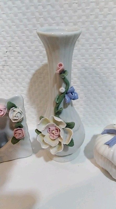 Trios porcelaine : vase , coffre a bojoux et porte-photo