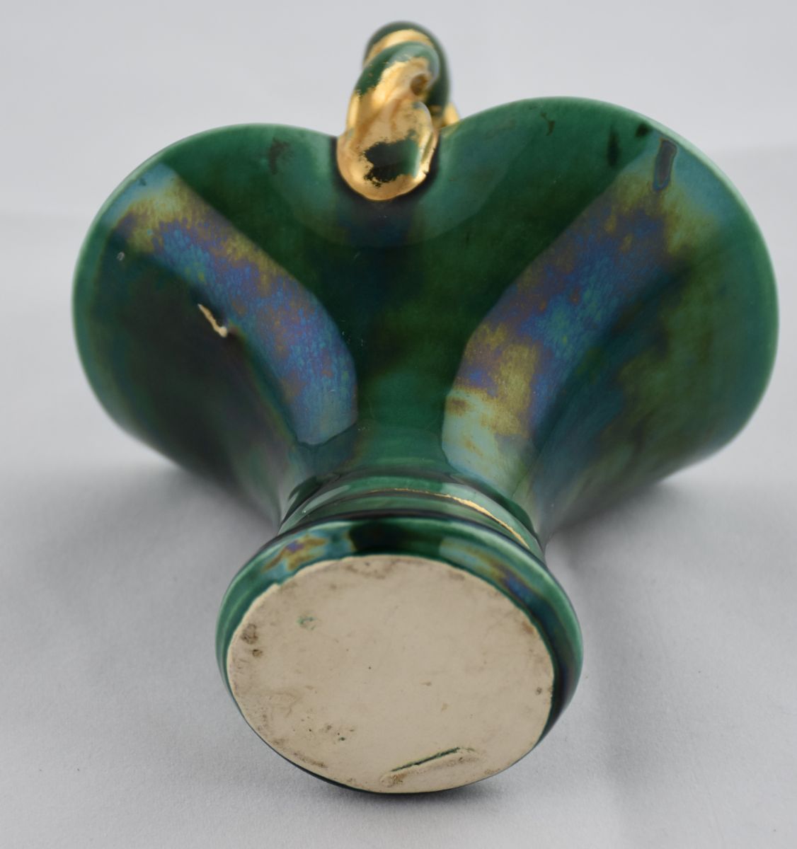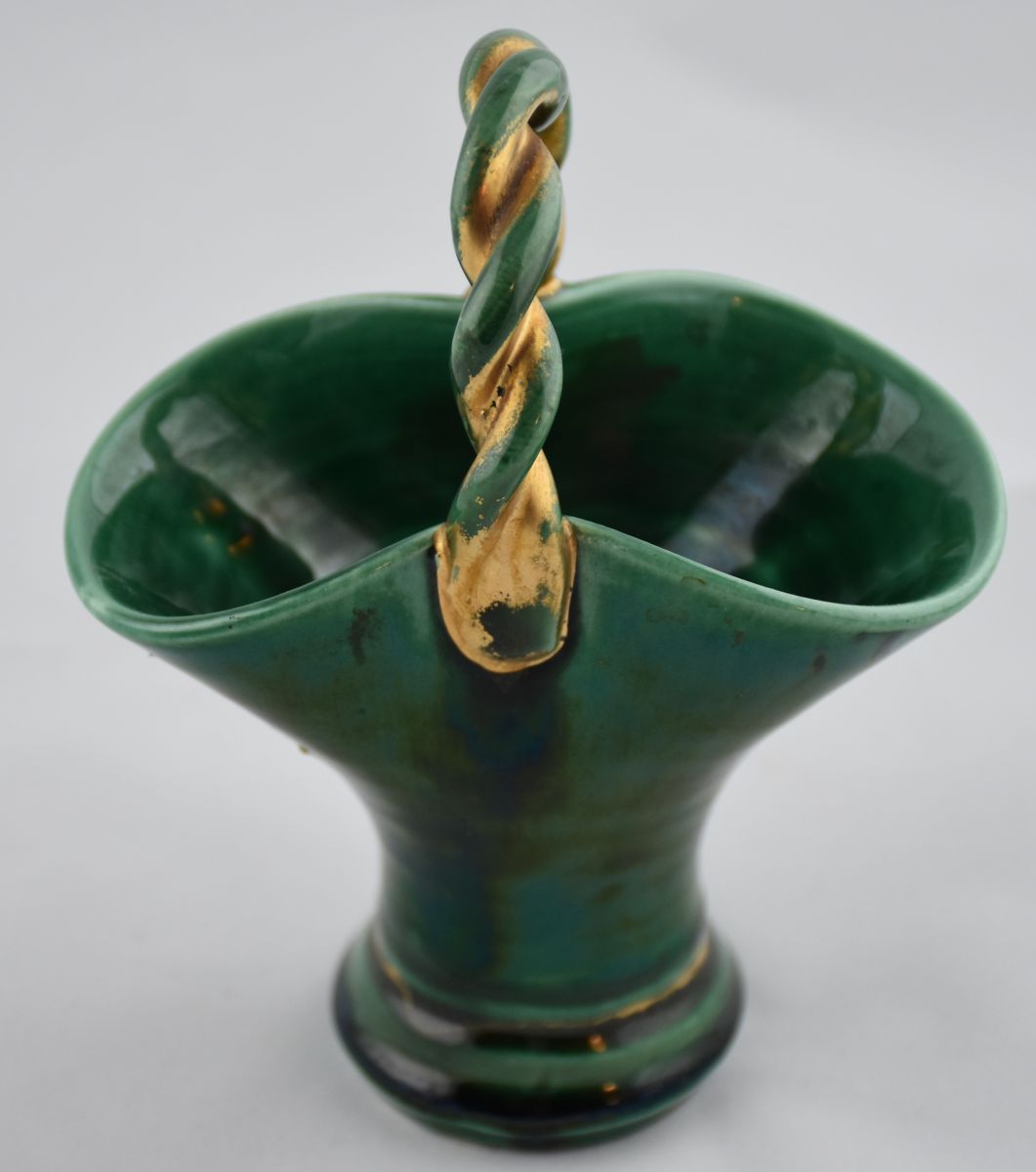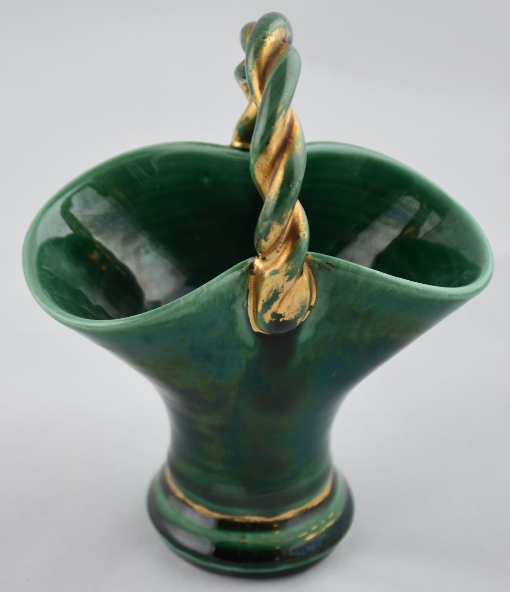 Petit panier émaillé d'un beau vert brillant. Dorures sur l'anse, en partie effacées, ce qui n'enlève rien au charme vintage de ce petit panier.
