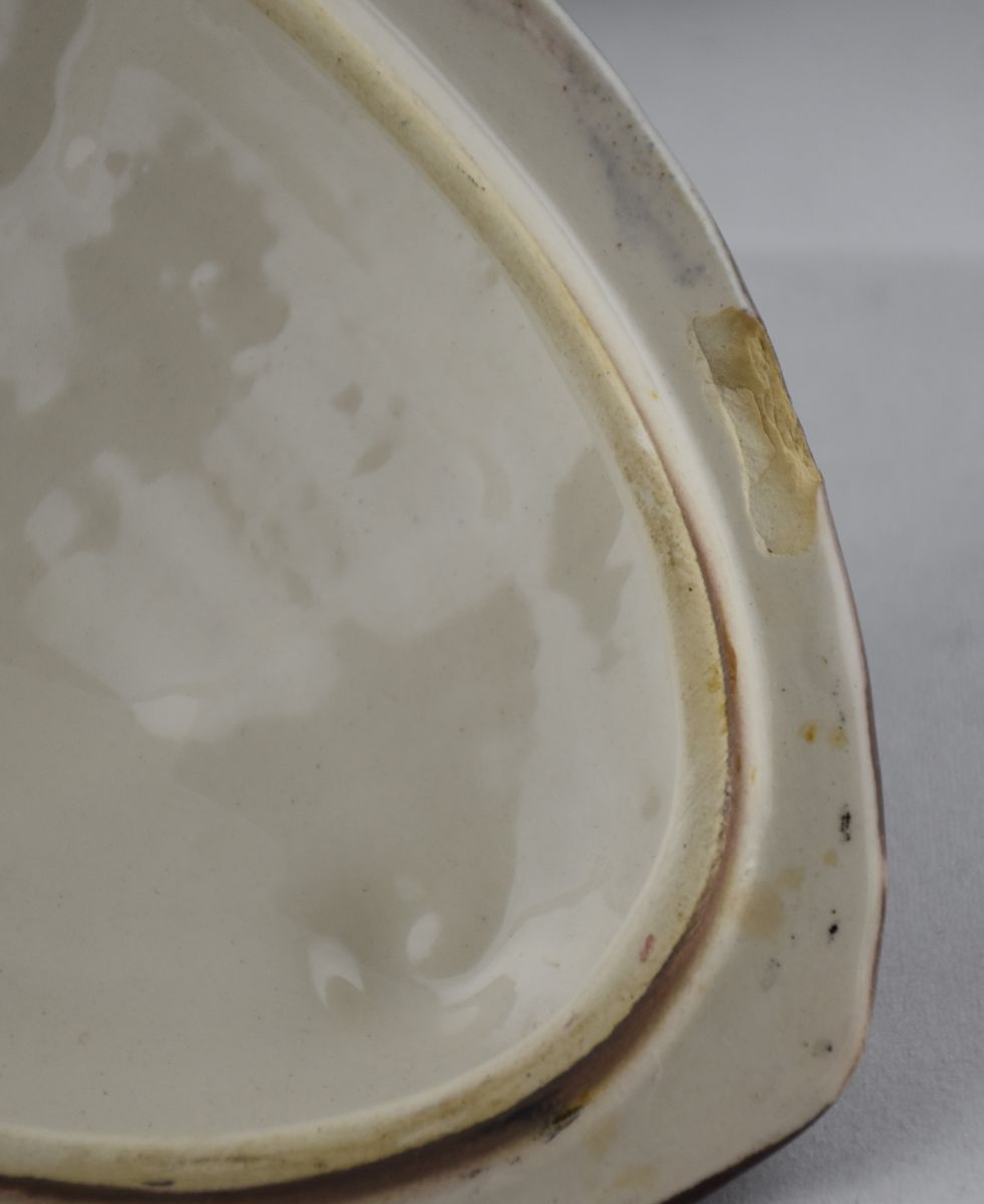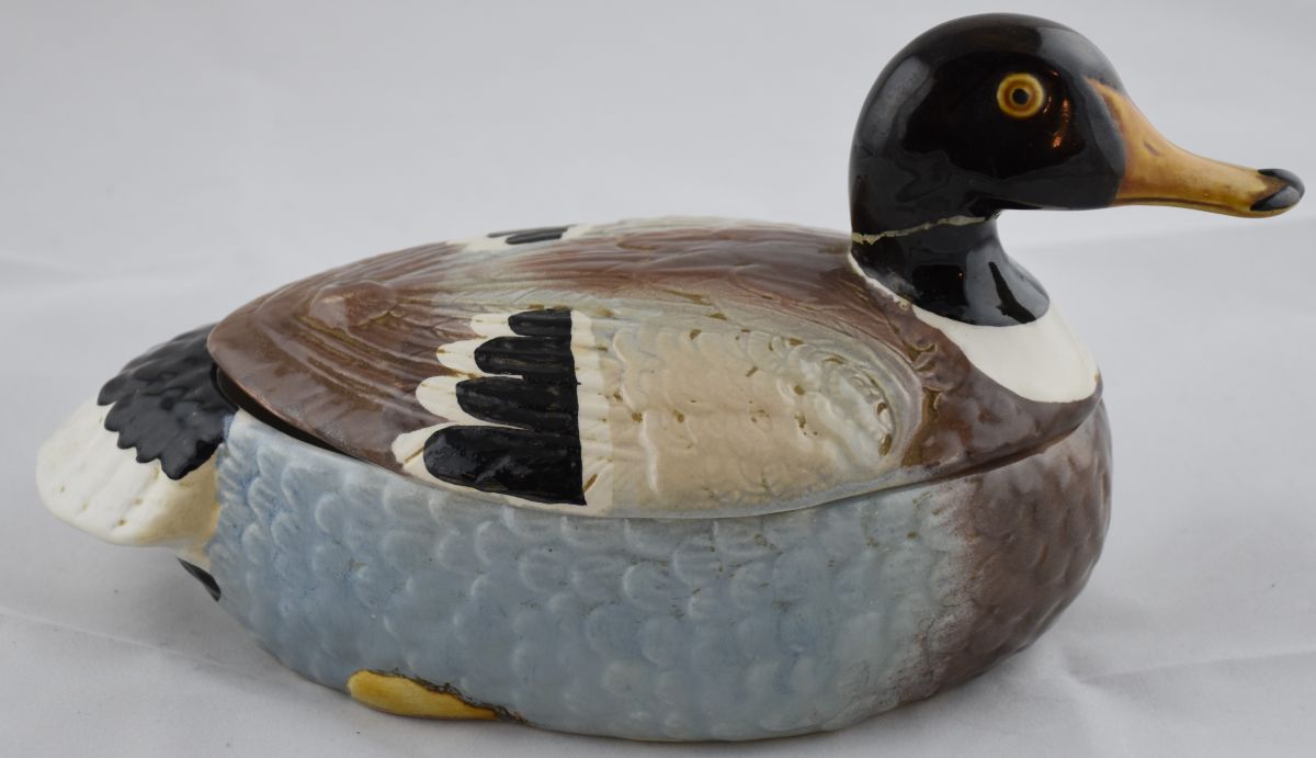 Terrine Michel Caugant en forme de canard, dans les tons bleu pâle, marron glacé et noir. La tête a été recollée (voir photos), le dessous du couvercle présente un éclat qui ne se voit pas quand la terrine est fermée. Marques de faïençage sur le dessous de la terrine.