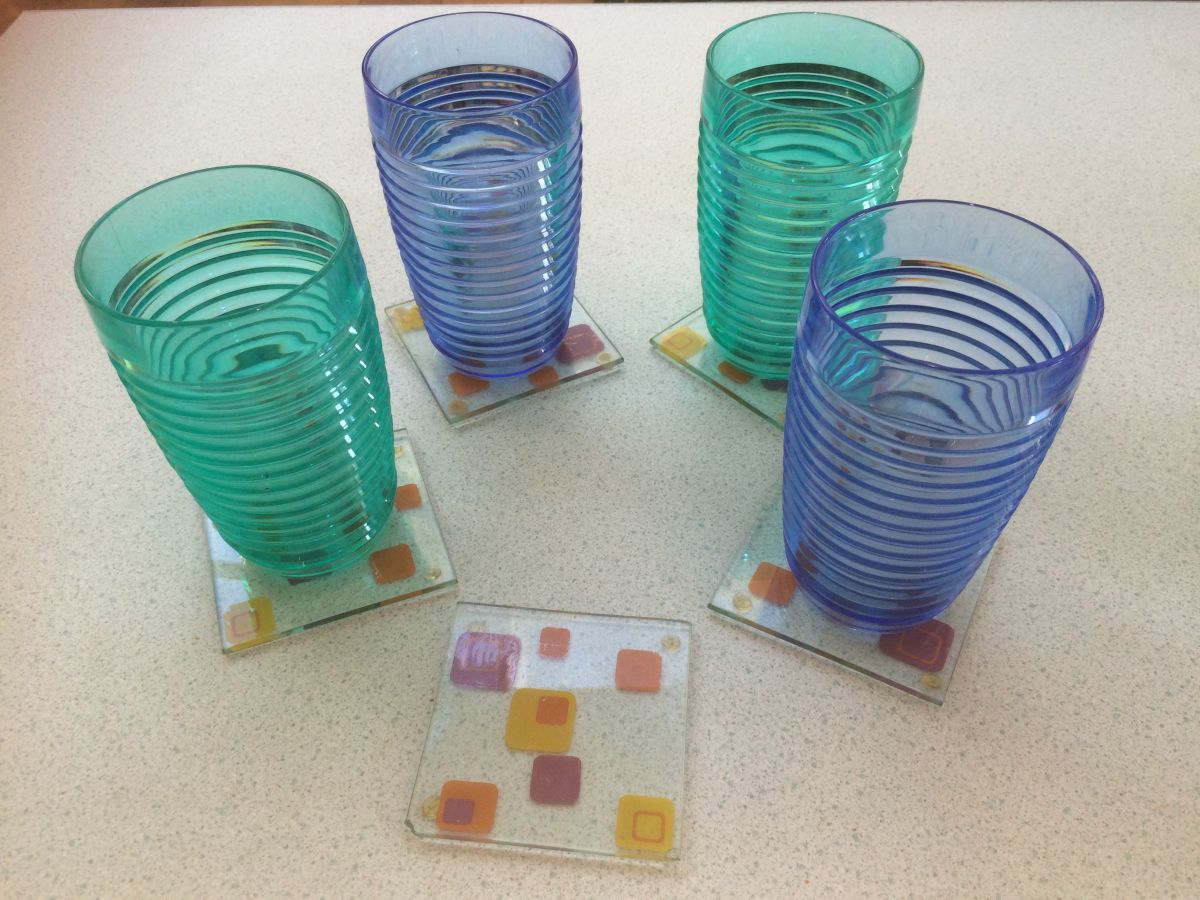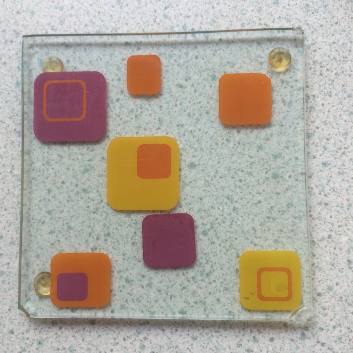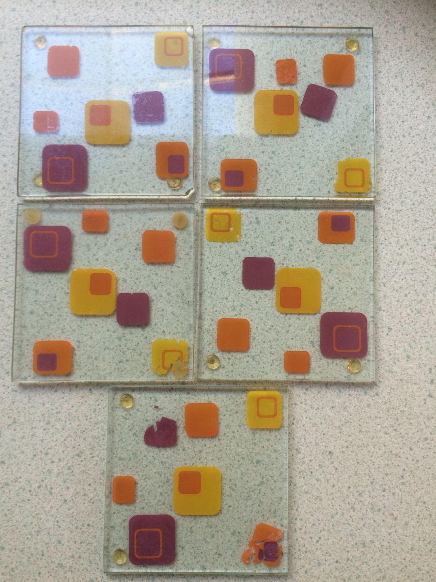 Ensemble de 5 dessous de verre très originaux en verre transparent avec motif pop coloré des années 60 en décalcomanie.