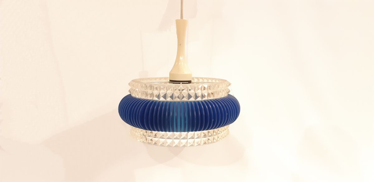 Lustre en verre avec des lamelles bleu en plastique tout autour.