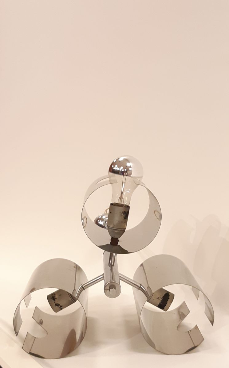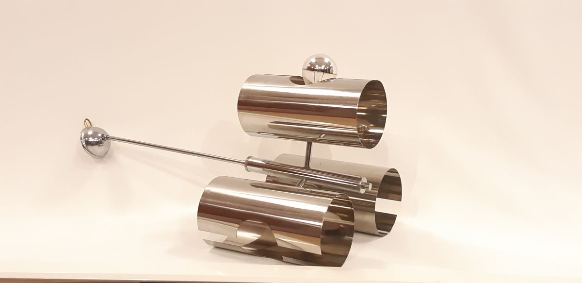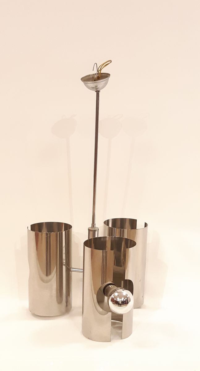 Lustre chromé avec 3 cylindres en inox et un tube en métal au centre.