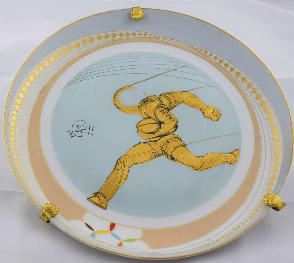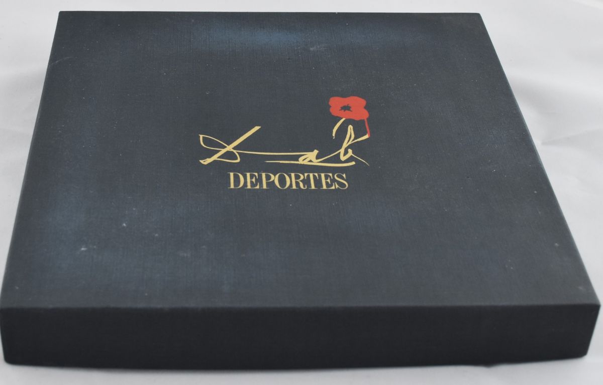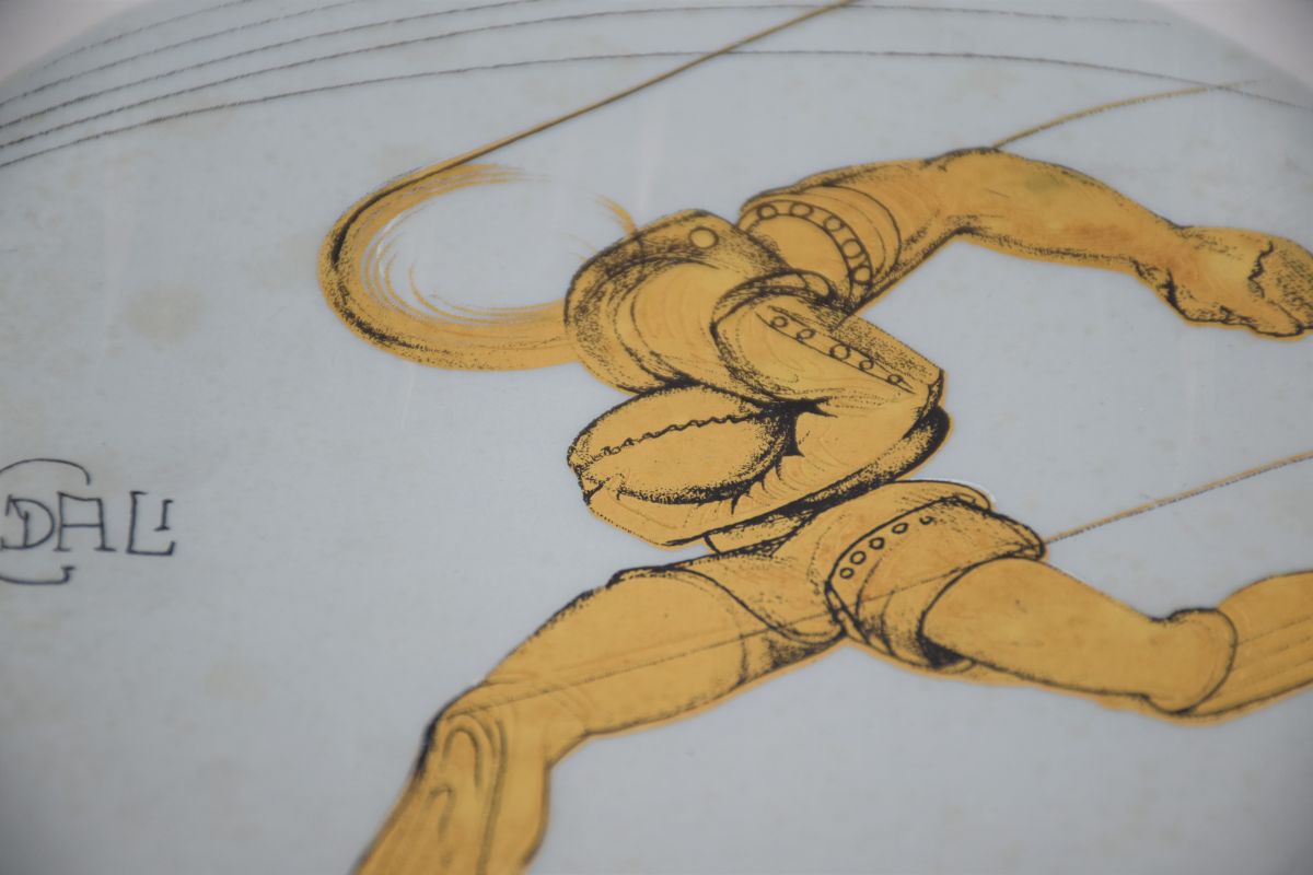 Assiette décorative en porcelaine dorée à l'or fin signée Salvador Dali. Elle fait partie de la série Deportes sur le thème des sports olympiques réalisée par Dali en 1978-80, et représente le rugby.