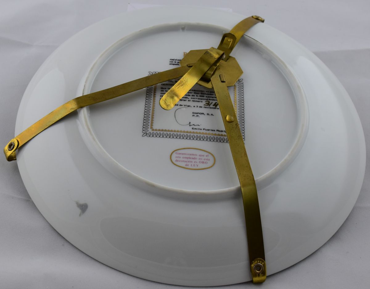 L'assiette est prête à être suspendue au mur grâce à un crochet terminé par de petites pattes griffues. Elle vous sera envoyée dans sa boîte d'origine et avec son certificat de garantie émis par le fabricant espagnol Dapor S.A.