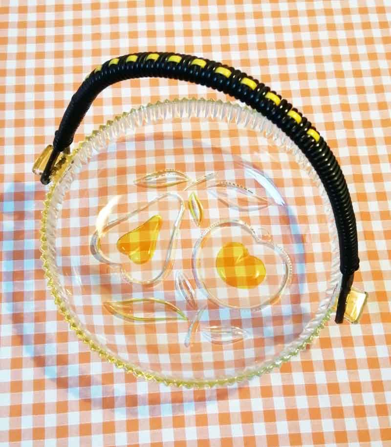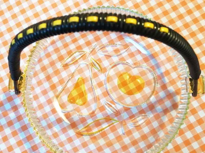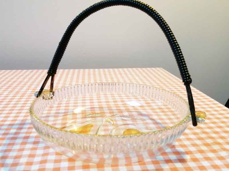 Coupe à fruits en verre moulé avec pomme et poire jaunes et anse scoubidou noire et jaune