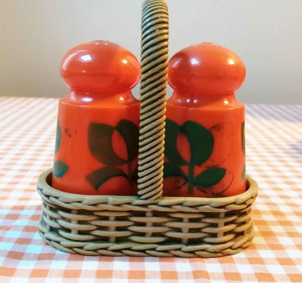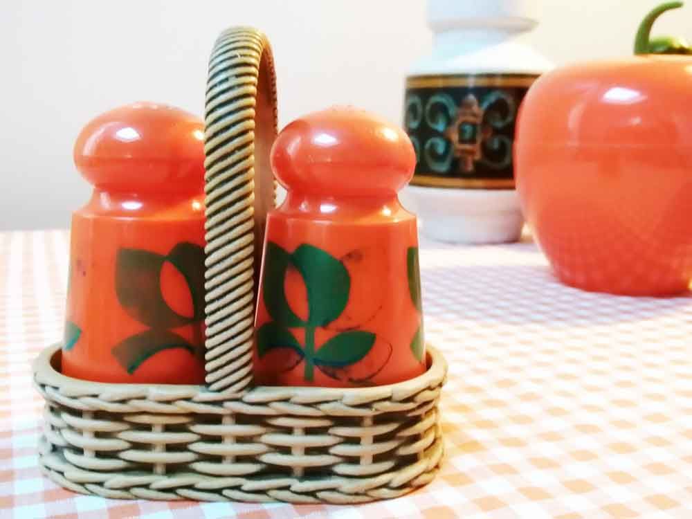 Joli set salière/poivrière EMSA en plastique orange, motifs fleurs (bleu-vert) légèrement estompés par endroits (dû au passage du temps) et sa panière, très 70's pour un effet pep's garanti !