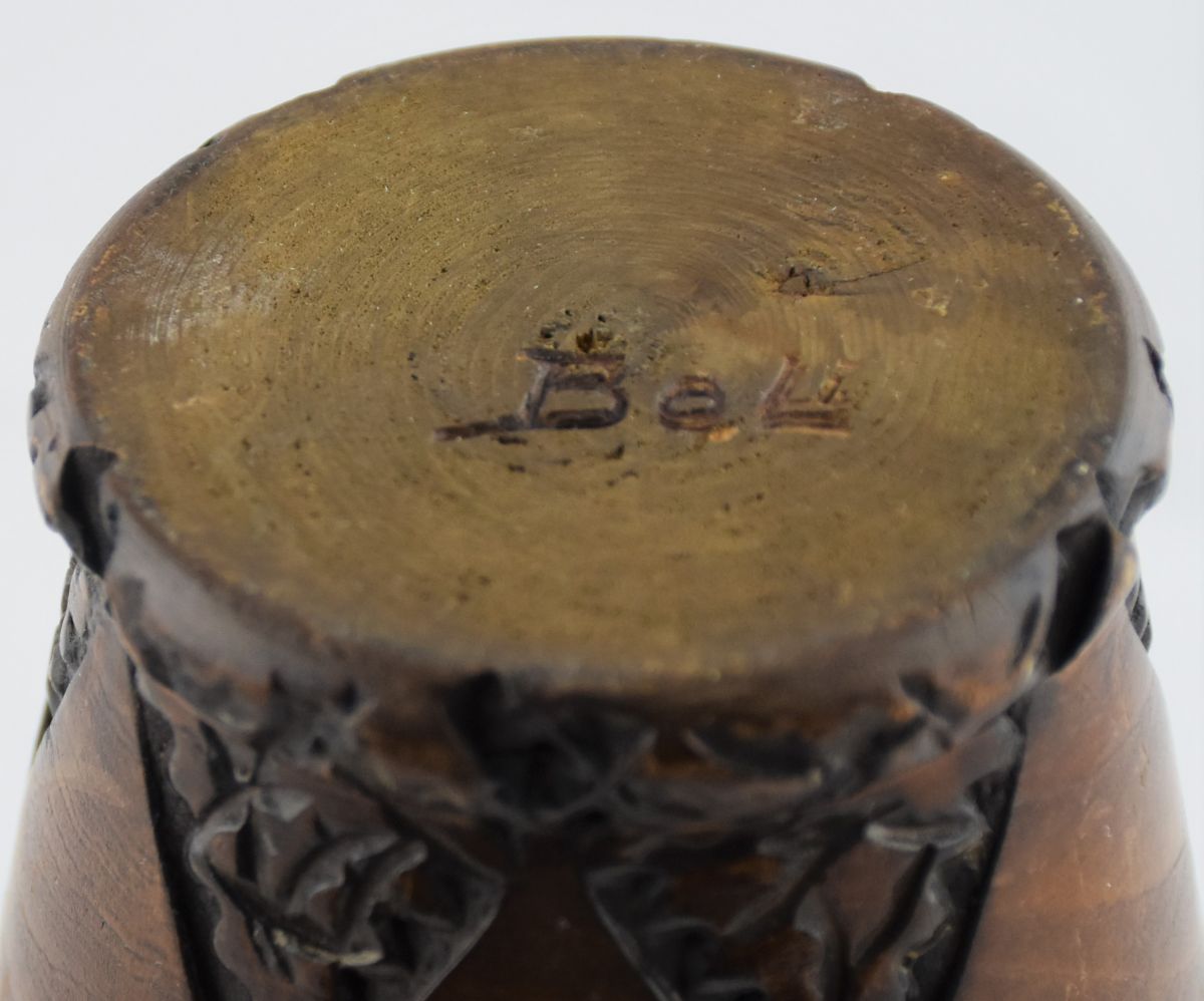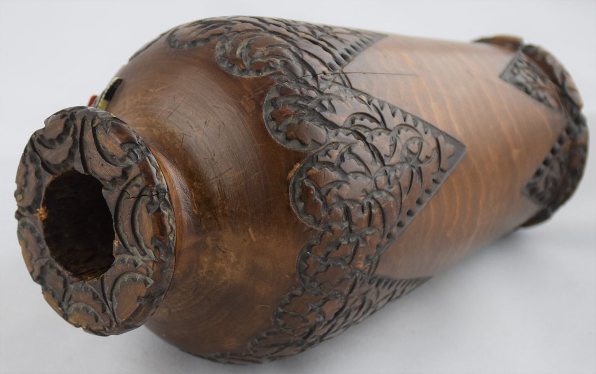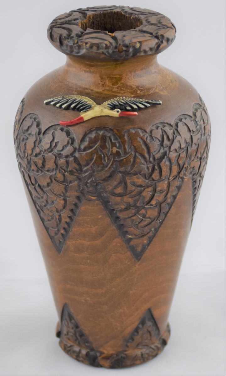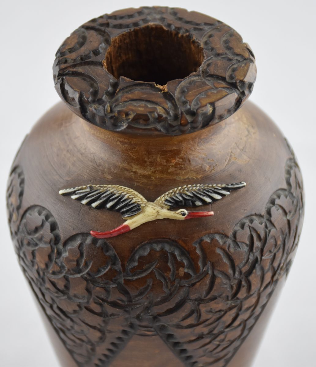 Vase en bois gravé. Il est signé Boli au-dessous. Début XXe. Vase formé au tour et gravé d'une guirlande de coeurs. Petite cigogne en plastique de couleur en haut. Bon état vintage, un début de fente sur un côté (voir photo du vase couché).