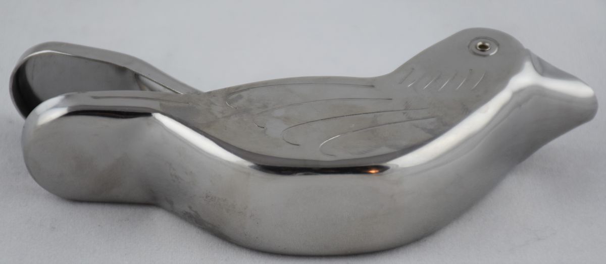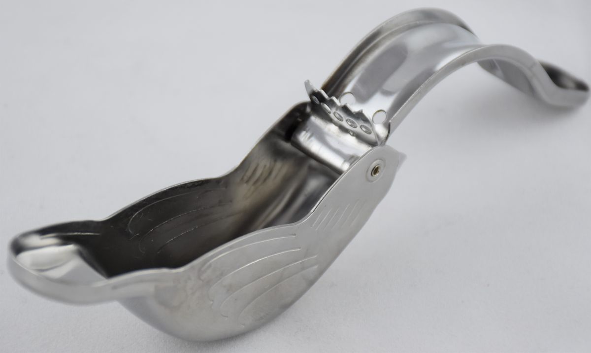 Oiseau en inox pour presser un quartier de citron. Le jus coule par de petits trous à l'avant. Bon état vintage.