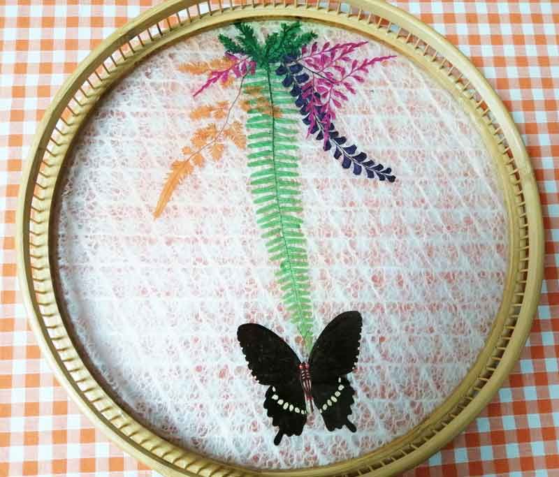 Joli plateau vintage en rotin et fond plexiglass motifs papillon & feuillages très 70's !