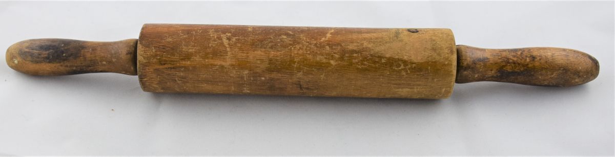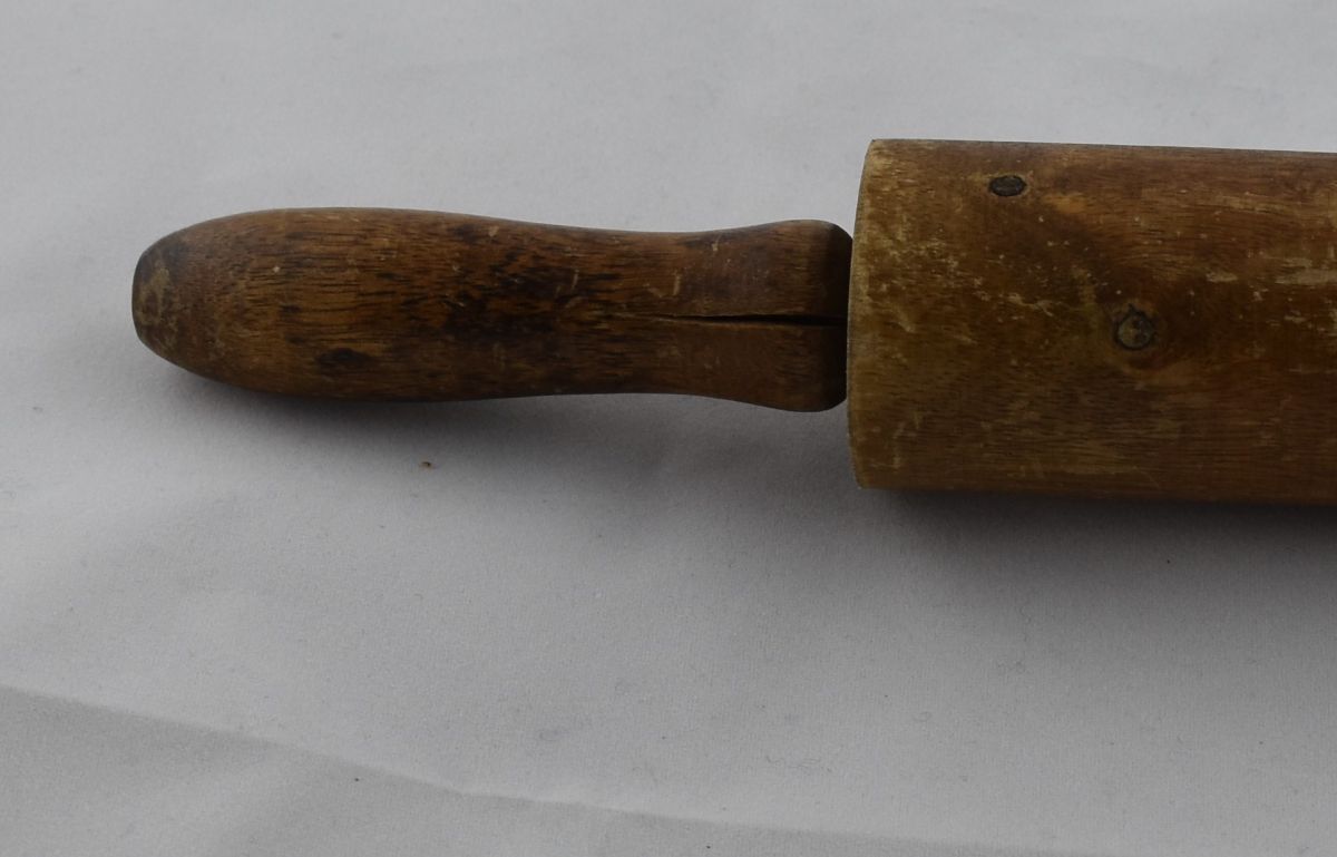 Petit rouleau à pâtisserie ancien en bois avec poignées mobiles. Belle patine vintage. Début de fente à l'une des poignées.