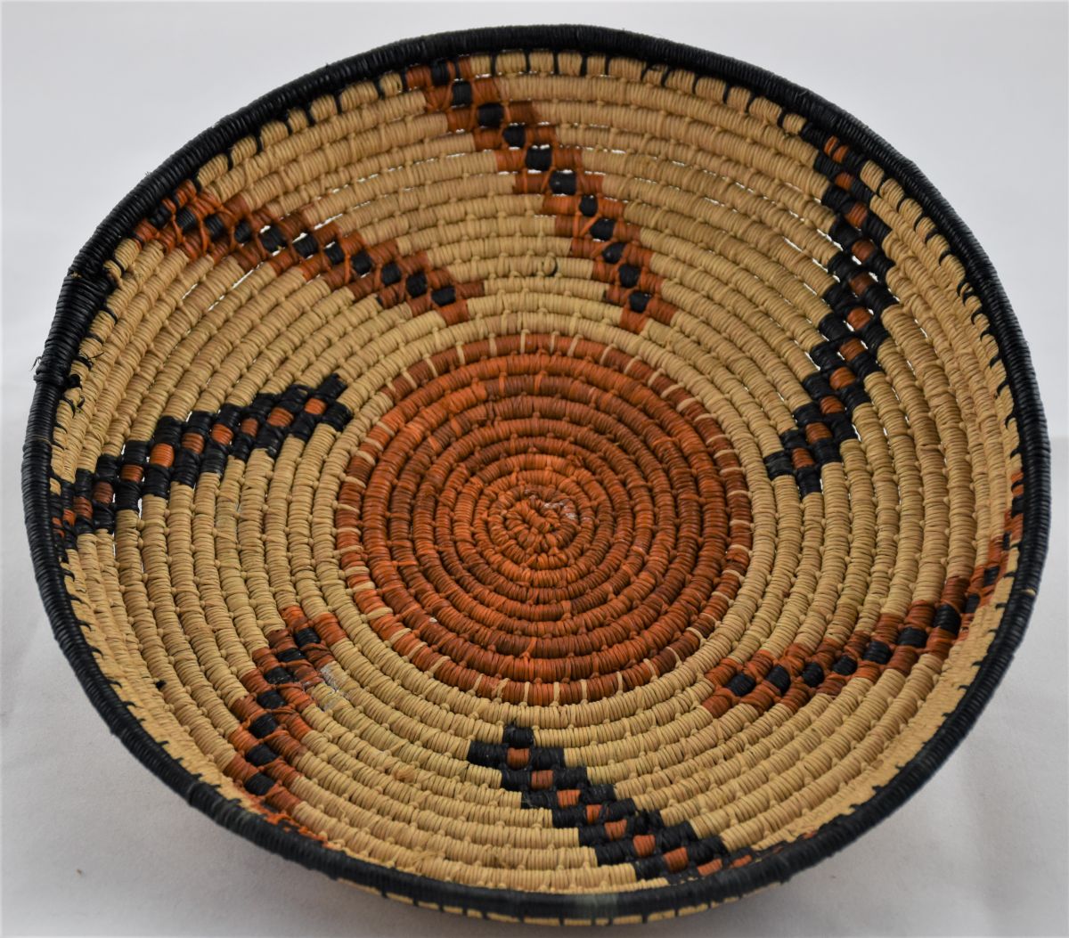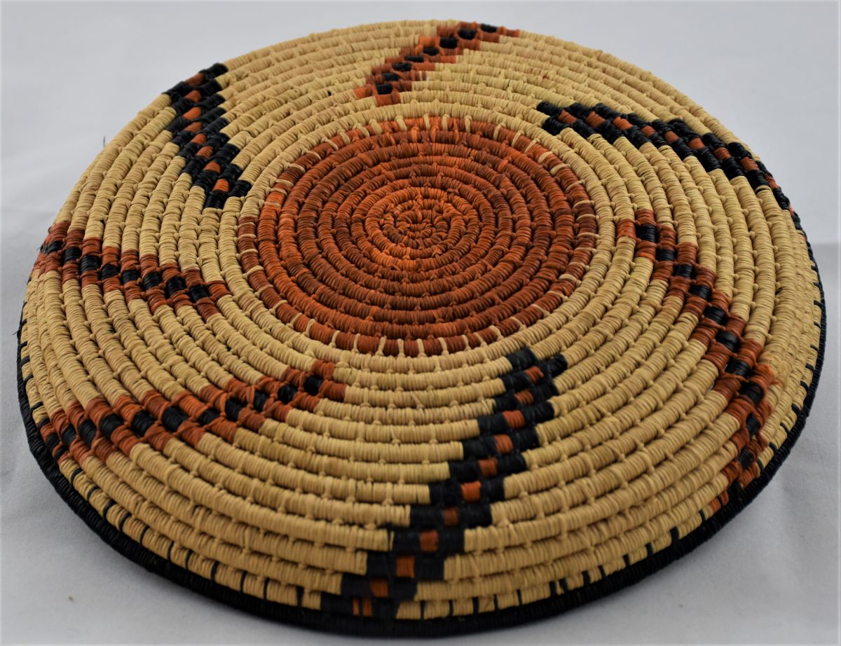 Corbeille en vannerie ancienne couleurs orange, noir et naturel.