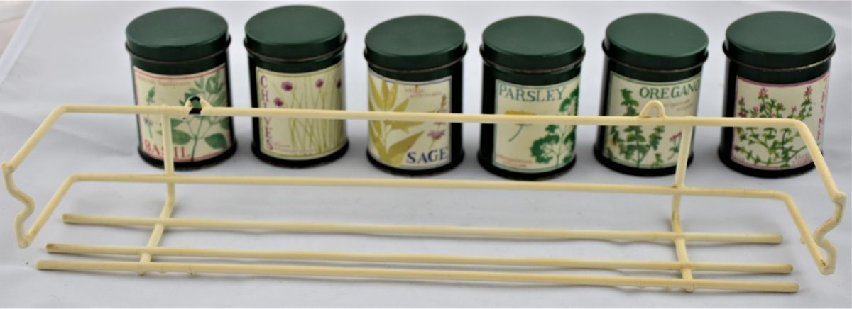 Etagère présentoir à épices en métal gainé et 6 pots en métal décorés de dessins façon aquarelle.