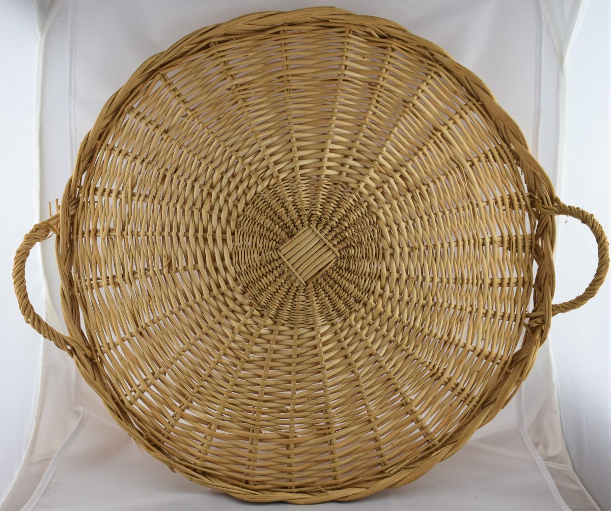 Très grand plateau en osier écorcé avec deux poignées. Défaut voir photo. Bords nattés. Années 1990.
