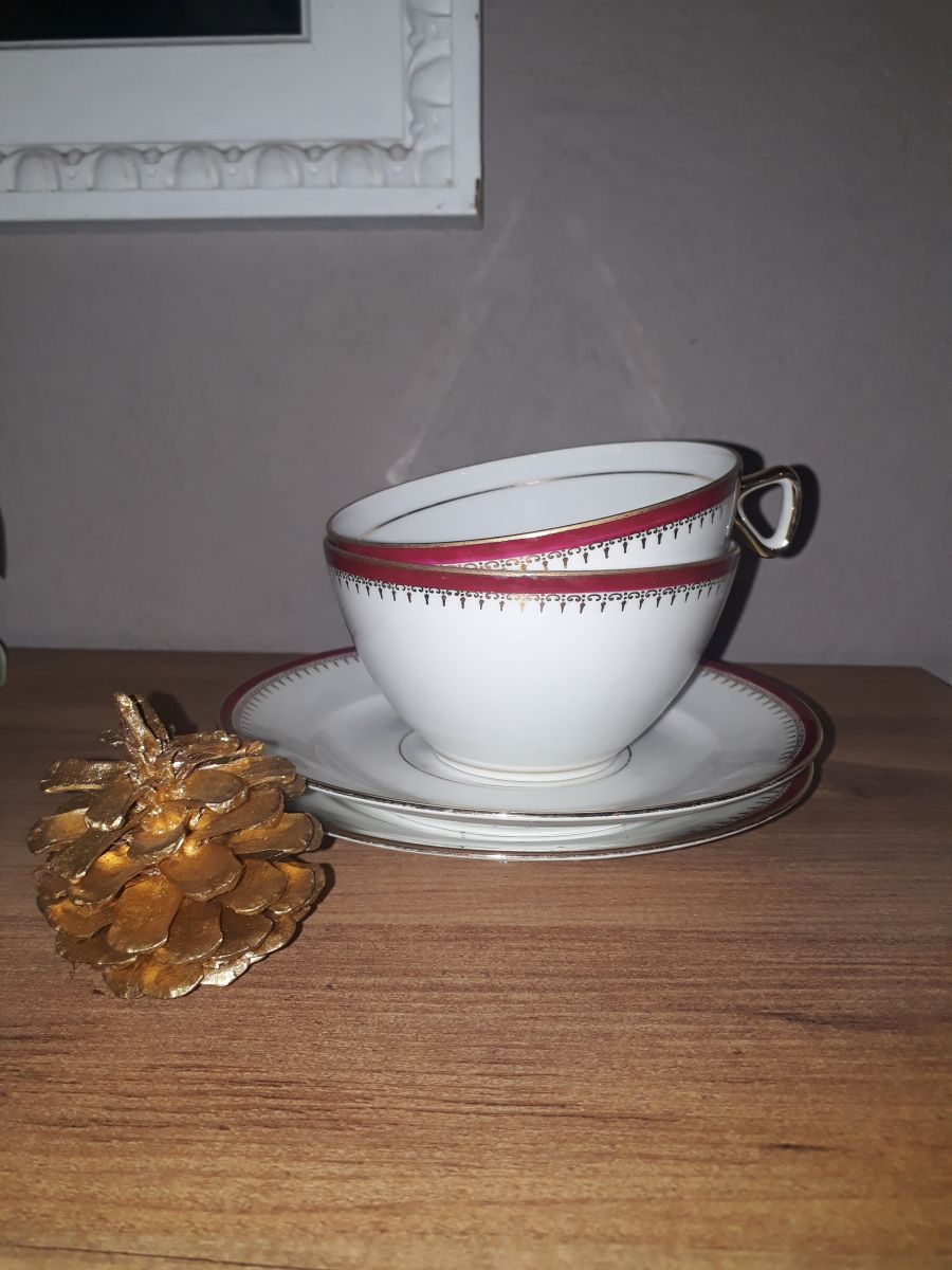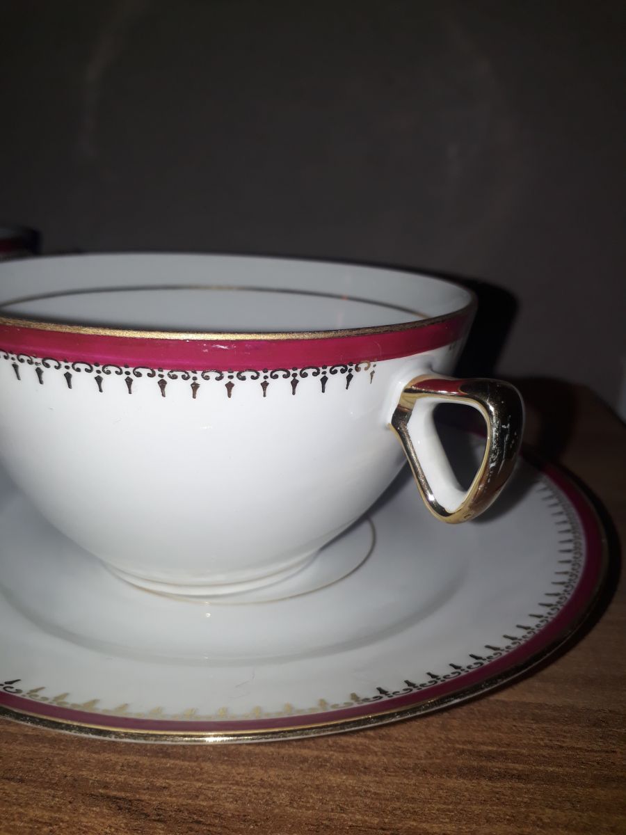 Bel ensemble de 2 tasses et sous-tasses en porcelaine France à décor de frises rouges et dorées. Trait doré à l'interieur des tasses, anses fines et petites, assez atypique et original.