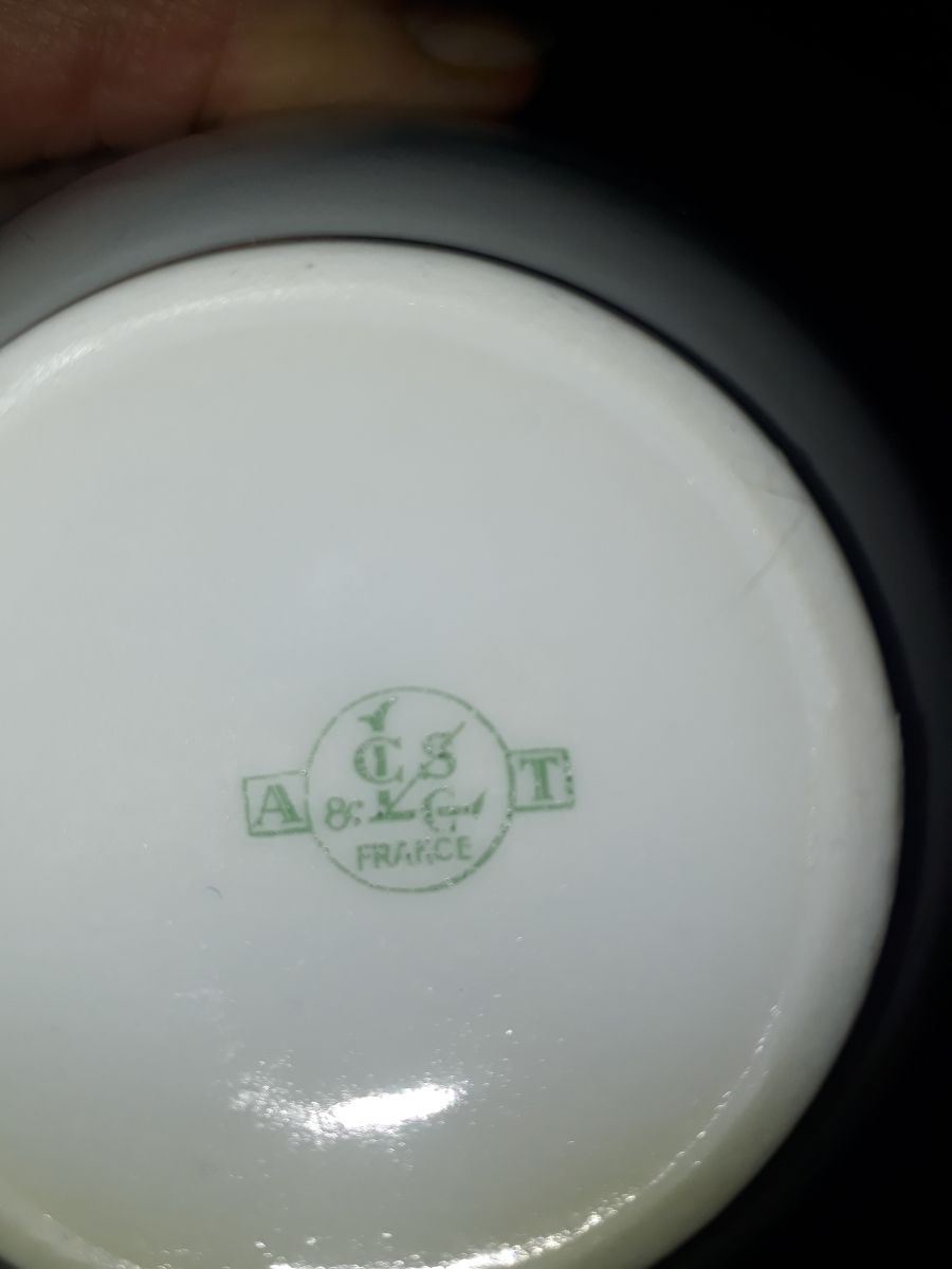 Estampillées sous la base ( AT & L.C.S.C). Tasse : 30 cl, 4, cm de hauteur, diamètre du buvant environ 8,4 cm. Diamètre de la soucoupe 12,5 c.