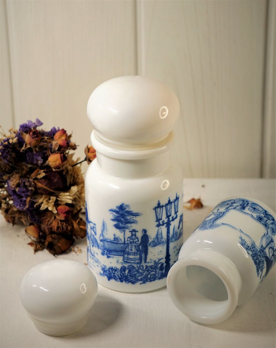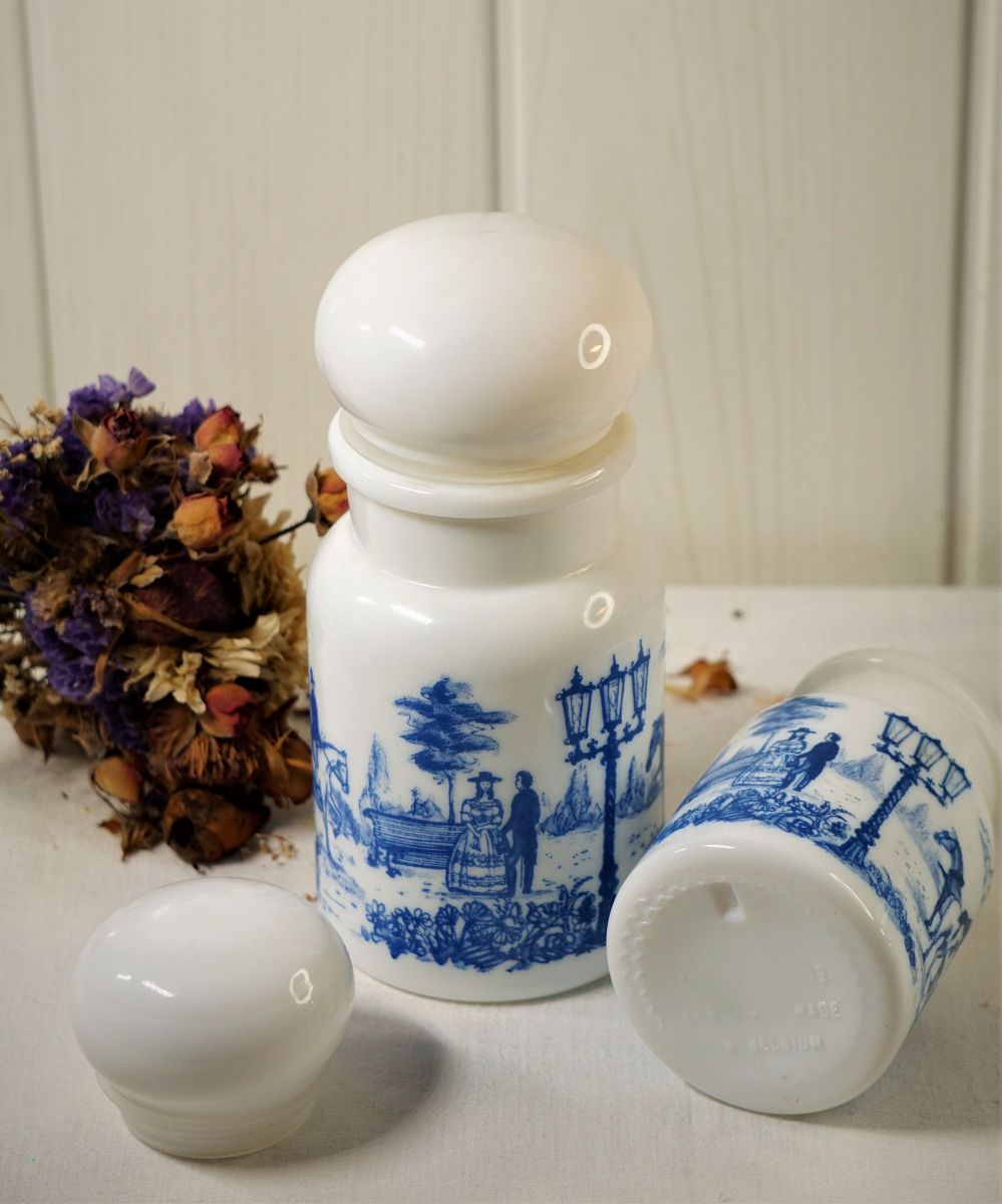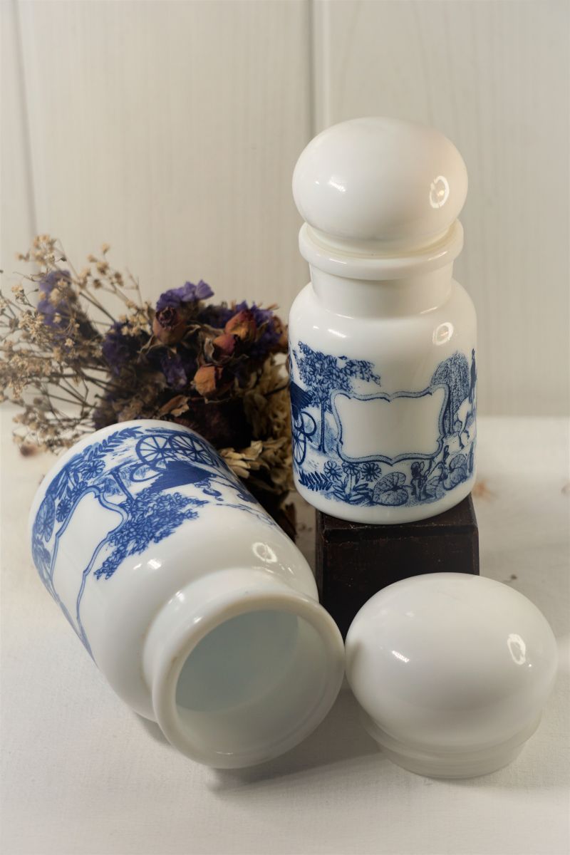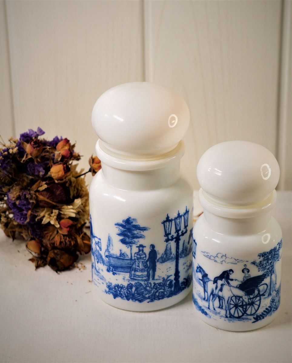 Ce sympathique couple de pots d'apothicaire, en excellent état fabriqués en verre opalisé de blanc possède un charme fou avec leurs illustrations empire. Ils apporteront une touche d'élégance à votre décoration. Pratique ils vous permettent d'y conserver herbes médicinales, tisanes, café ou chicorée , tout en conservant saveurs, et vertus grâce à leurs embouchure jointée et hermétique.