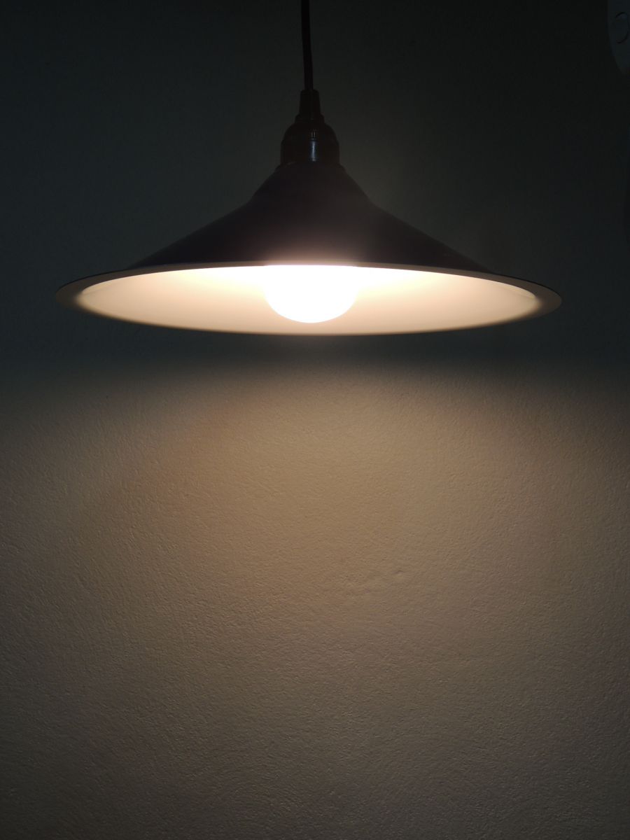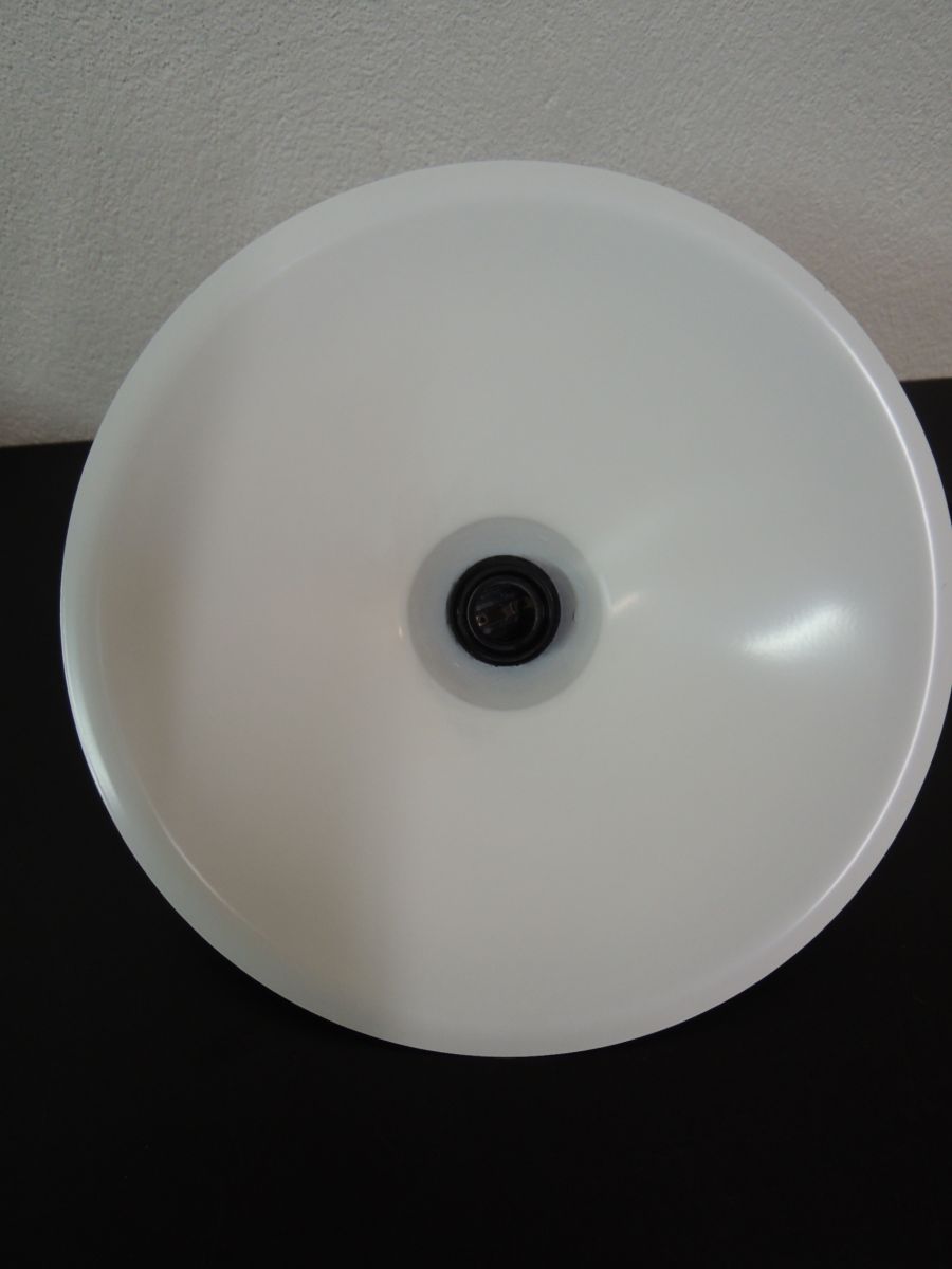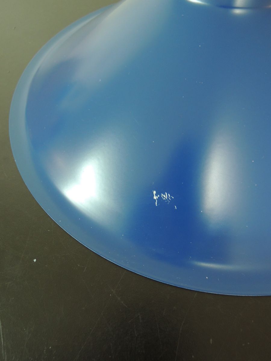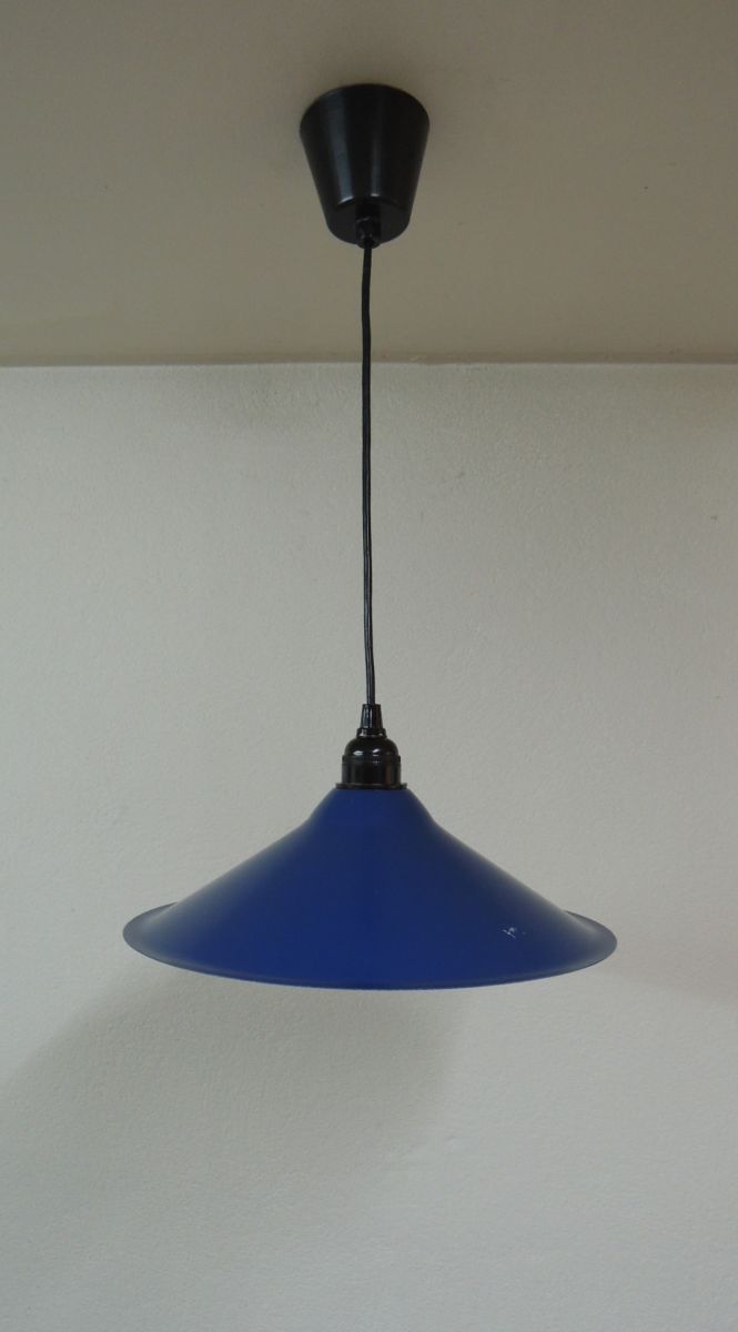 Suspension des années 80, en métal , couleur bleu, intérieur blanc sans défaut. Douille à vis type E27, pavillon cache fils en PVC noir, électricité contrôlée. Petite éraflure sur le dessus (cf dernière photo).