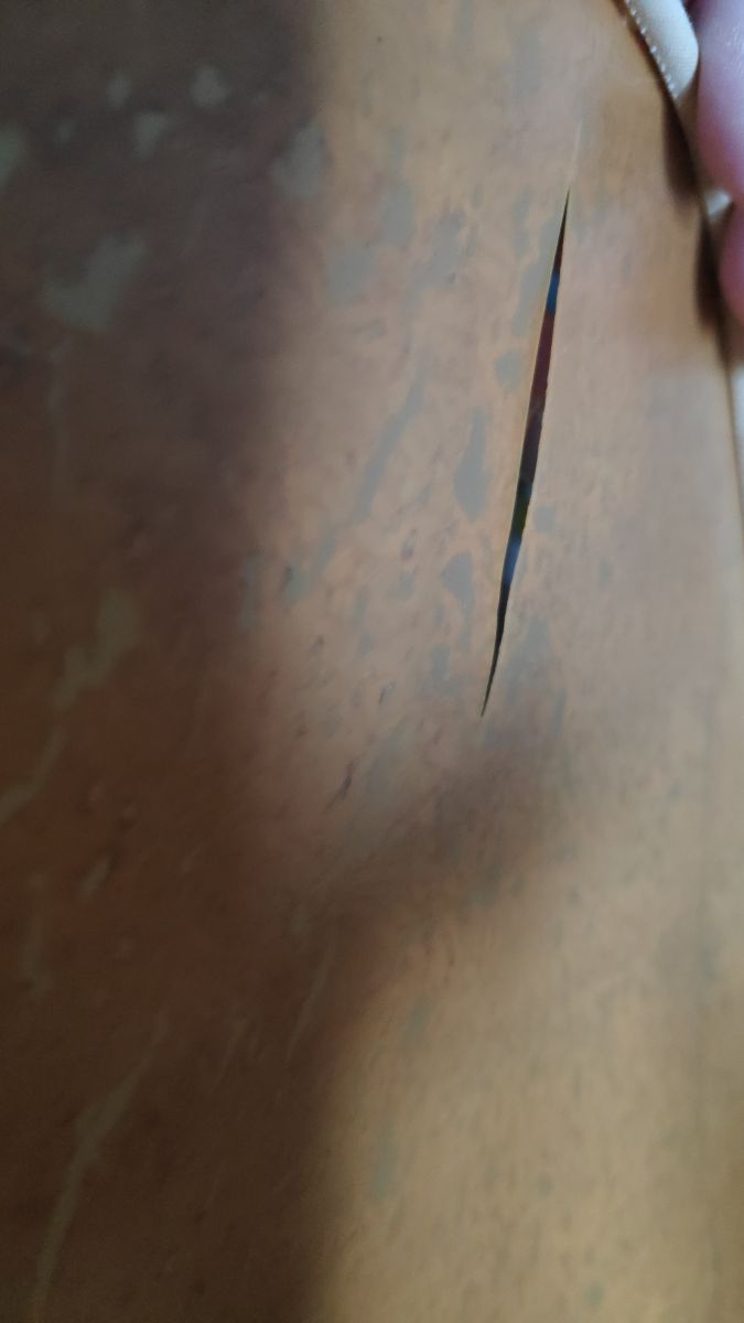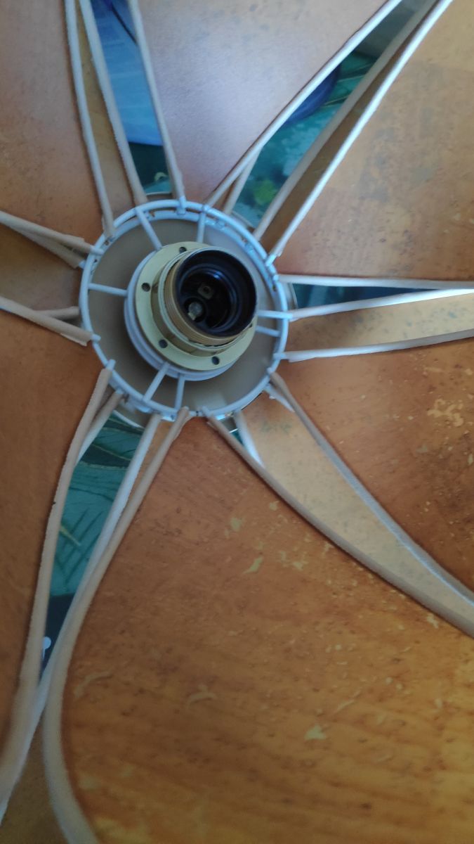 1 grande feuille est fendue mais c'est sans conséquence, ça ne se voit pas, surtout suspendu au plafond