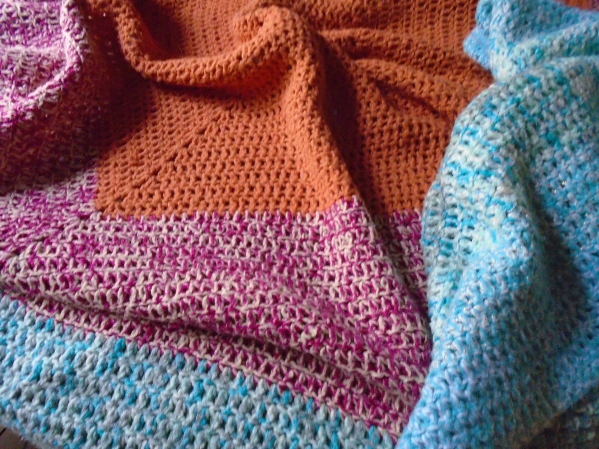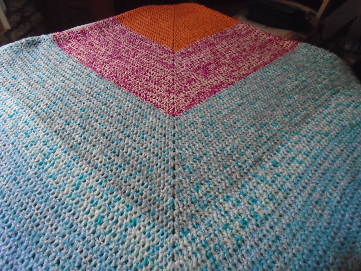 Grand plaid en laine crochetée, tons de orange, turquoise, gris clair et rouge clair chiné