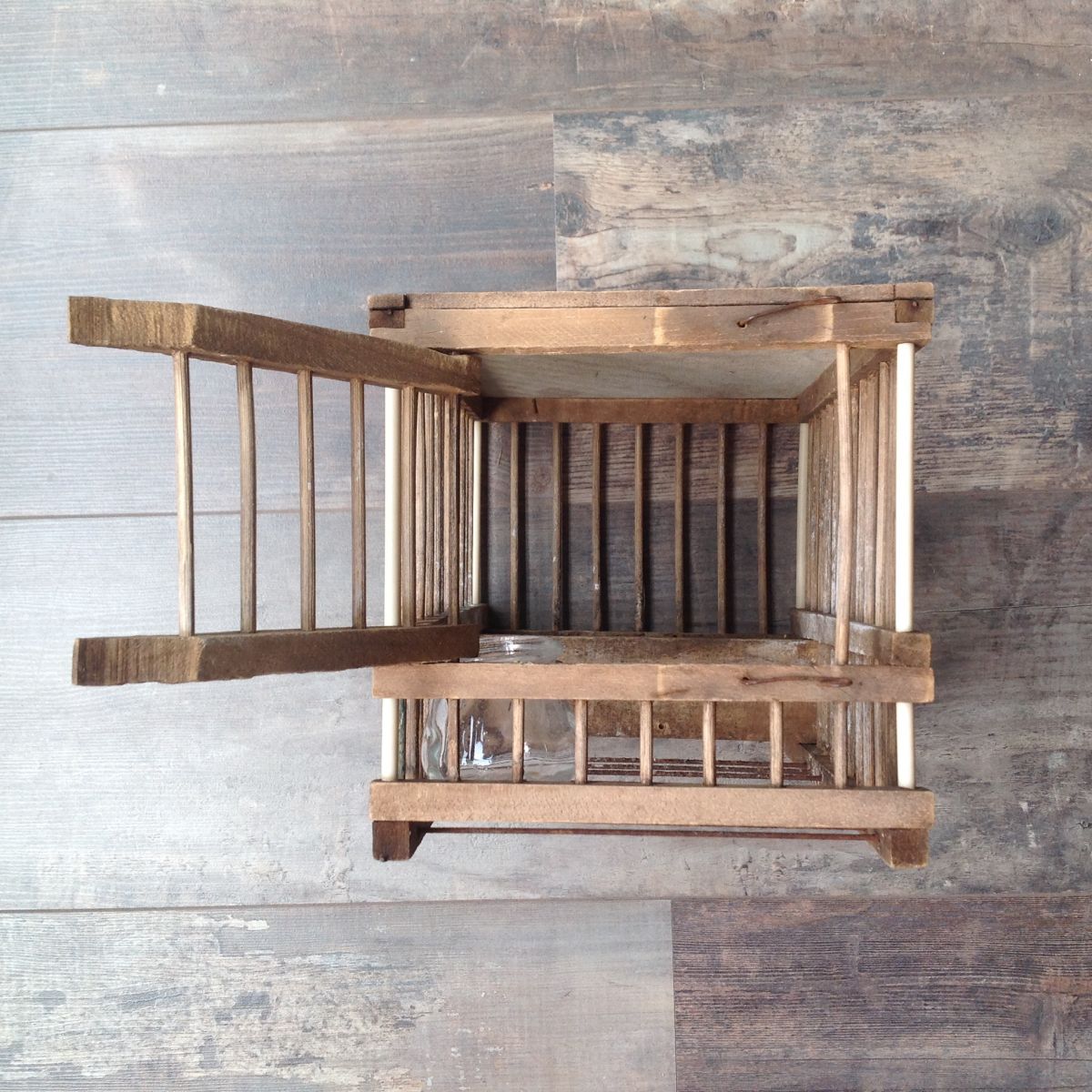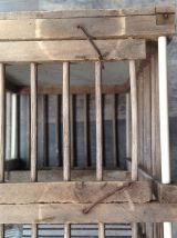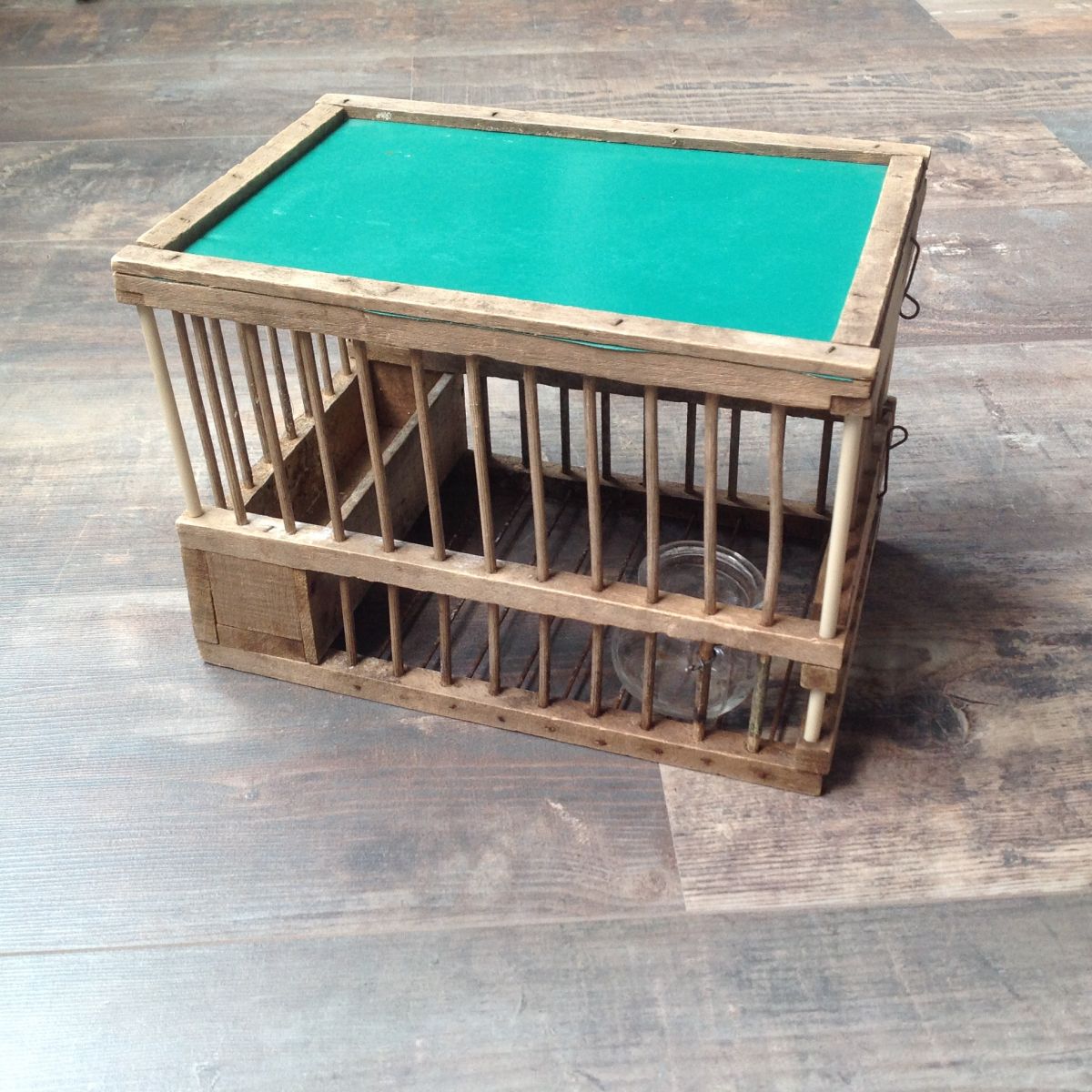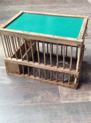 Petite cage à oiseaux ( plus précisément à grives) , bon état général, dessus recouverte d'une toile plastifiée verte , à l'intérieur mangeoire en bois et godet en verre.