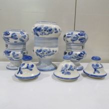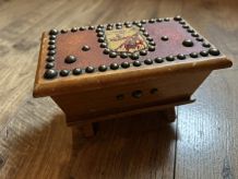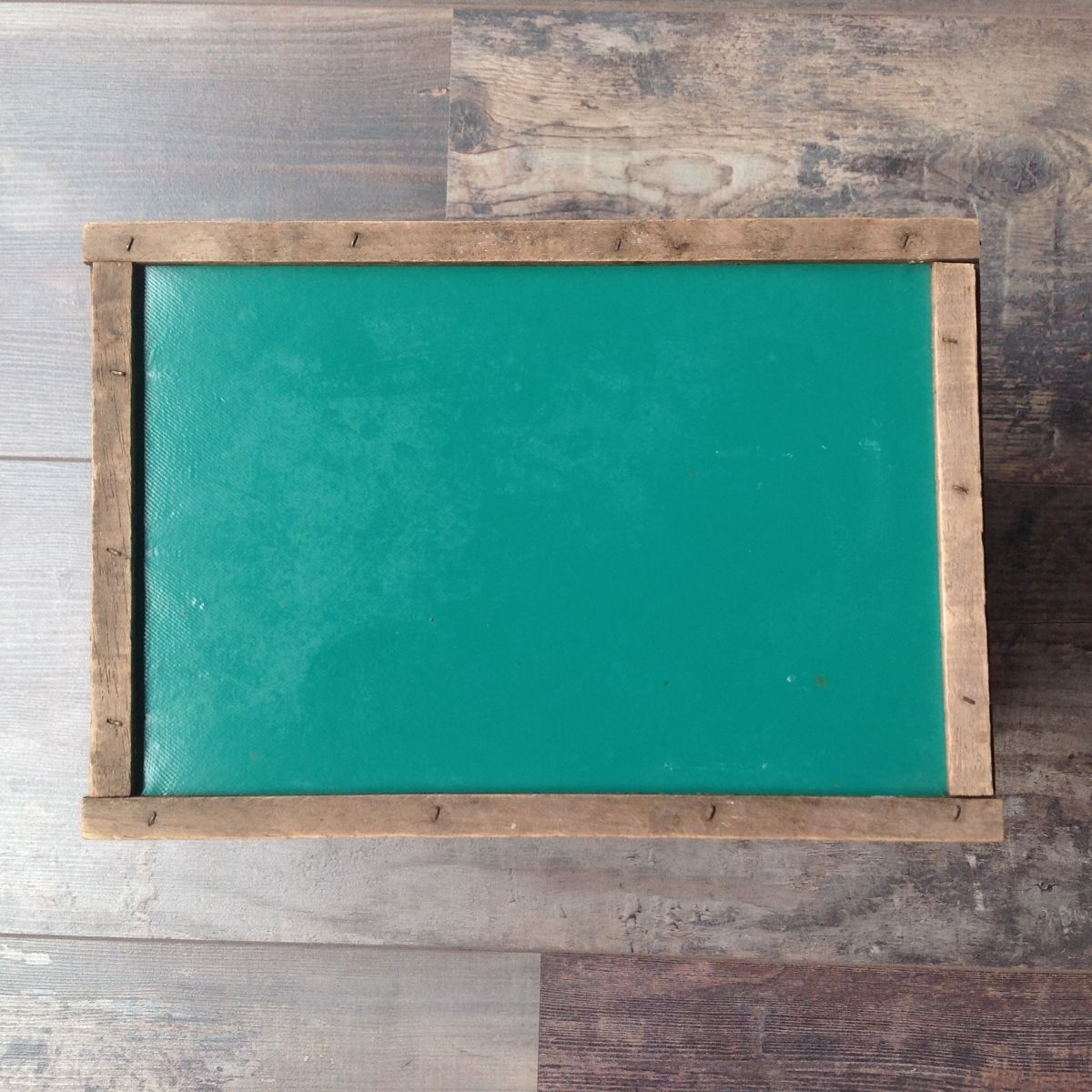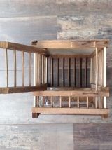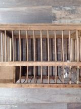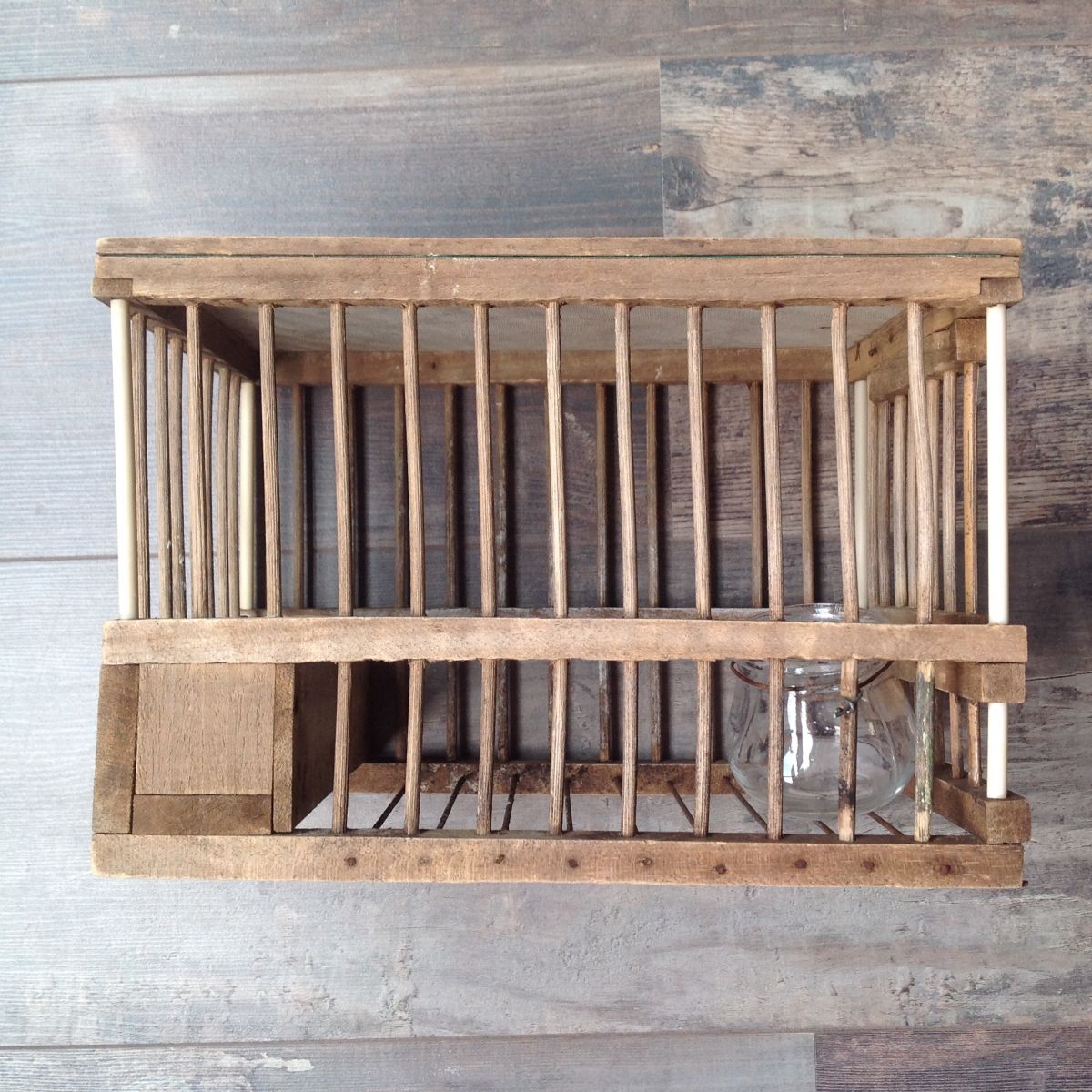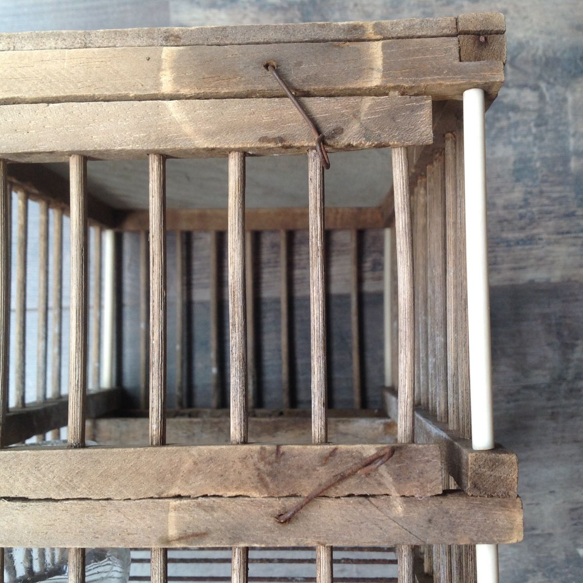 Petite cage à oiseaux ( plus précisément à grives) , bon état général, dessus recouverte d'une toile plastifiée verte , à l'intérieur mangeoire en bois et godet en verre.
