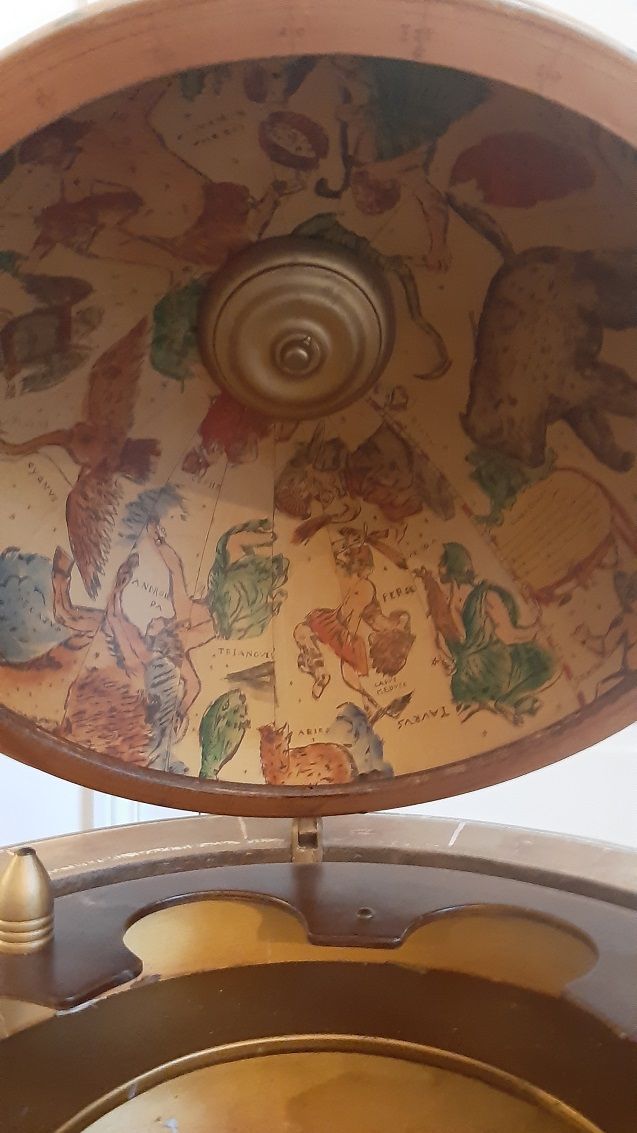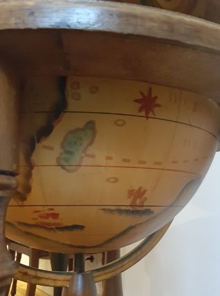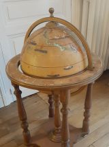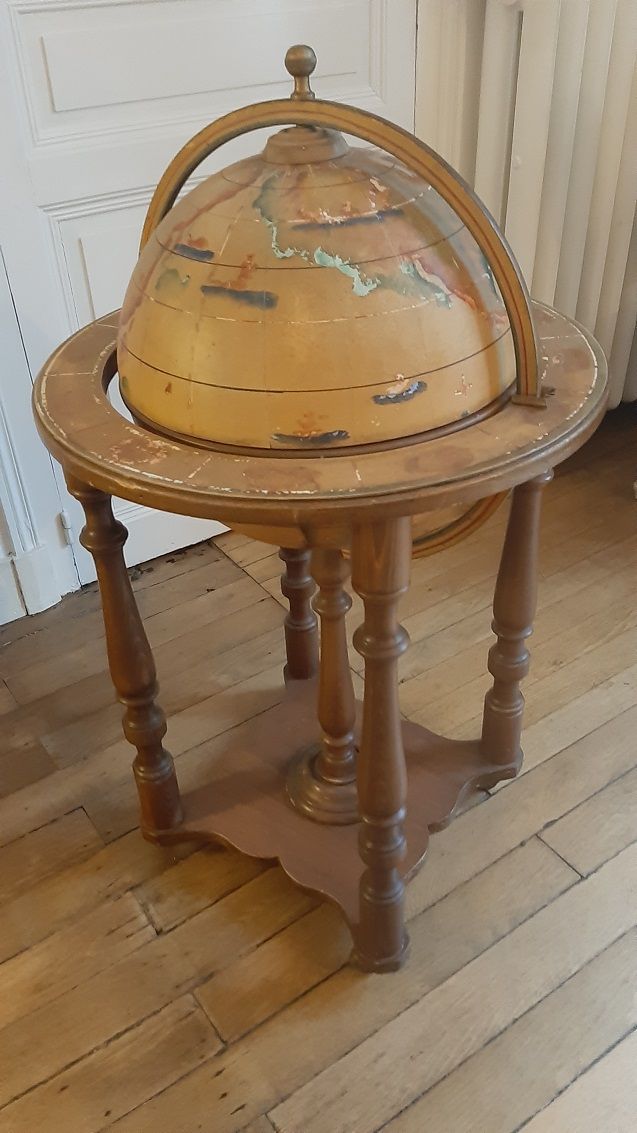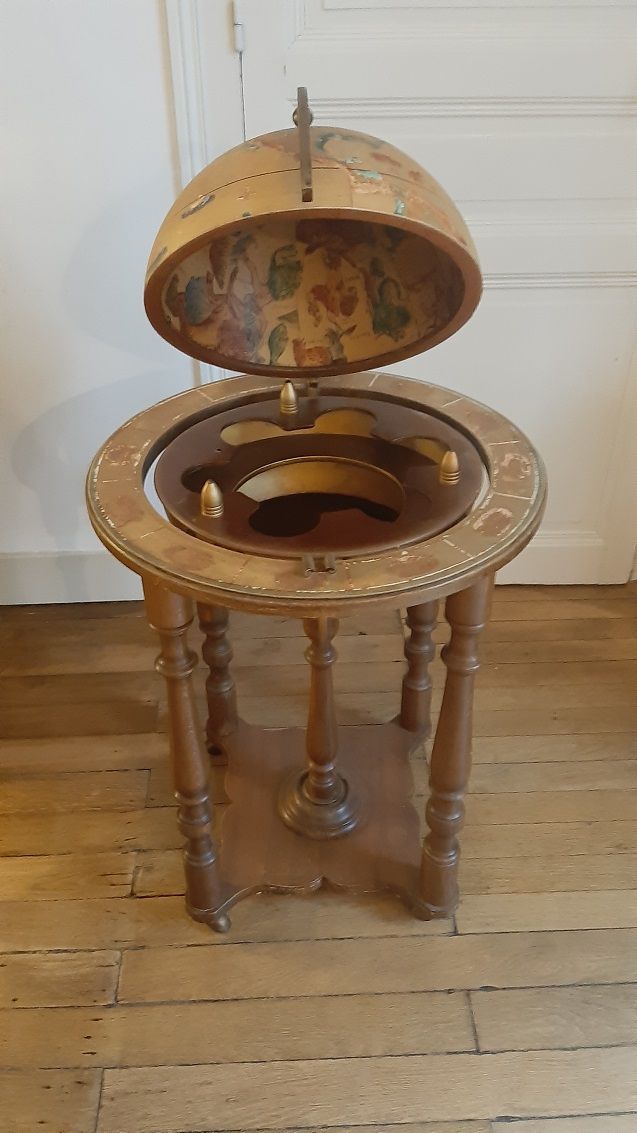 Mappemonde bar roulette, H 94 Largeur du globe 55. Globe s’ouvrant sur un plateau rotatif. Vintage