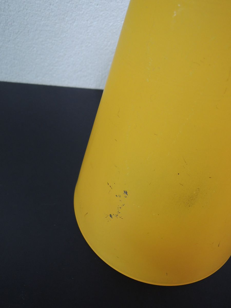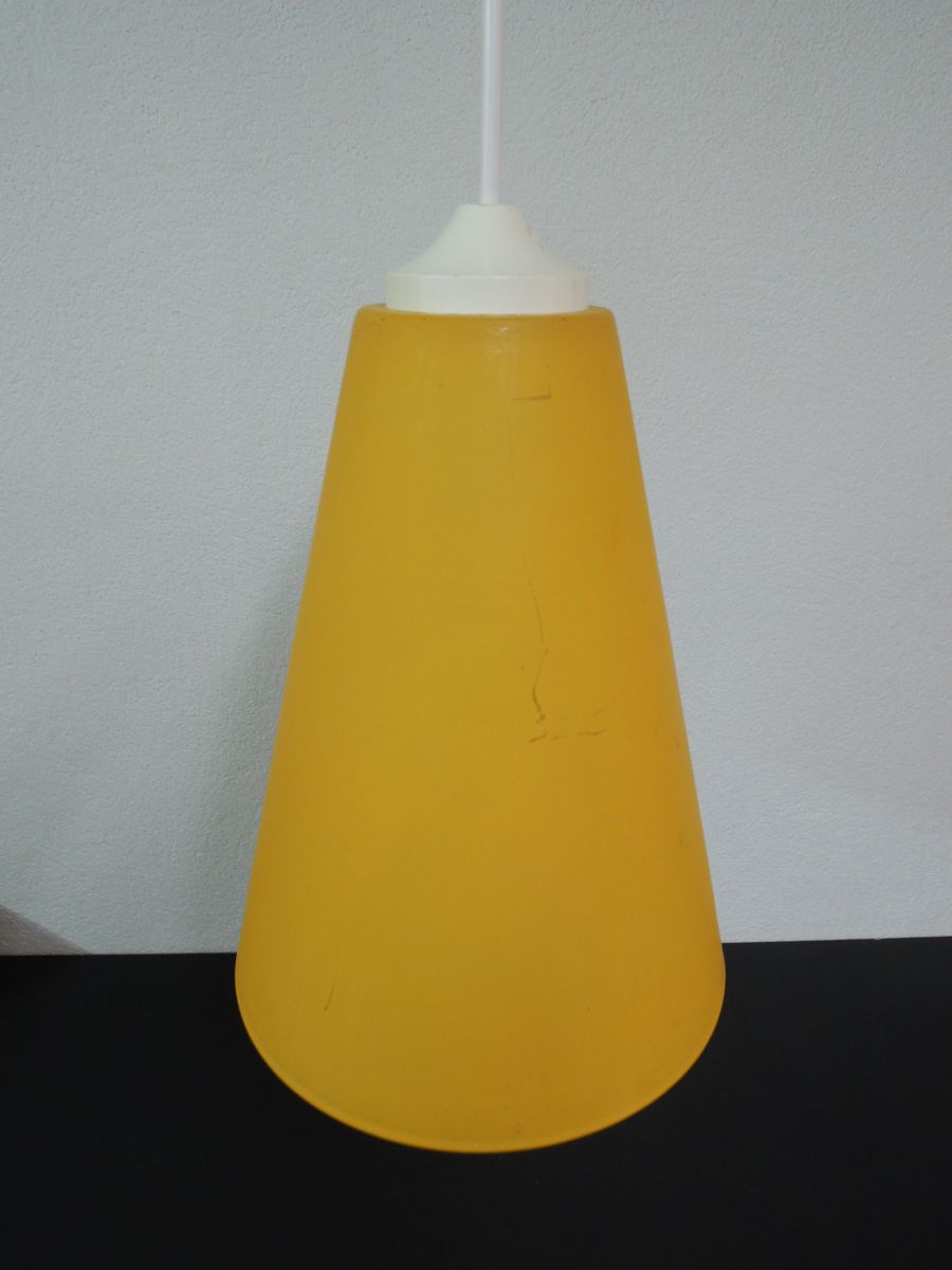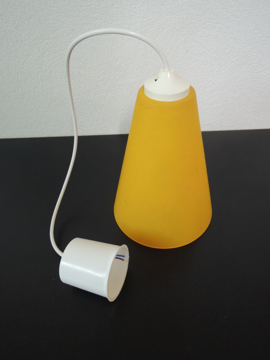 Suspension en verre épais, opaline orange mat, électricité révisée (câble neuf), douille à vis type E27, rayures par endroits avec altération de la couleur (cf dernière photo)