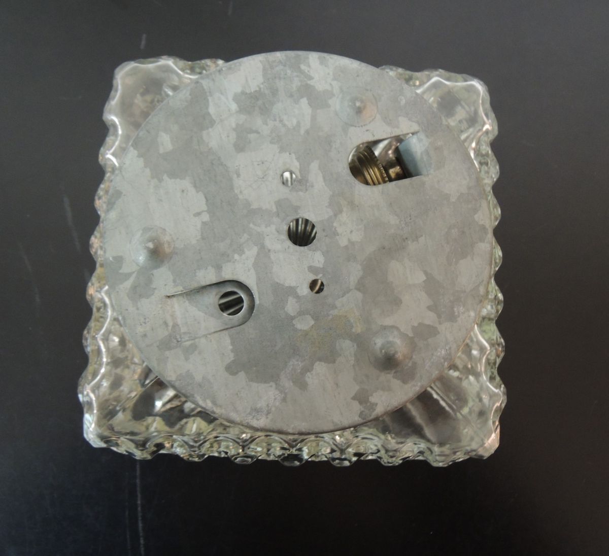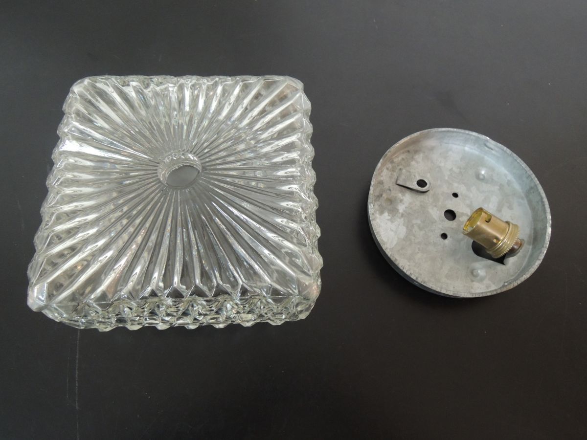 Plafonnier avec globe carré en verre ciselé vissé sur son support en acier galvanisé. Équipé d'une douille à baïonnette de type B22. Vendu non câblé.