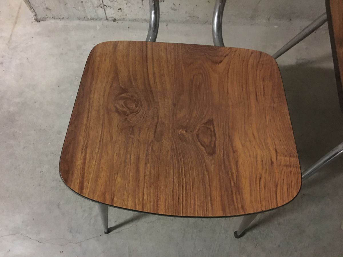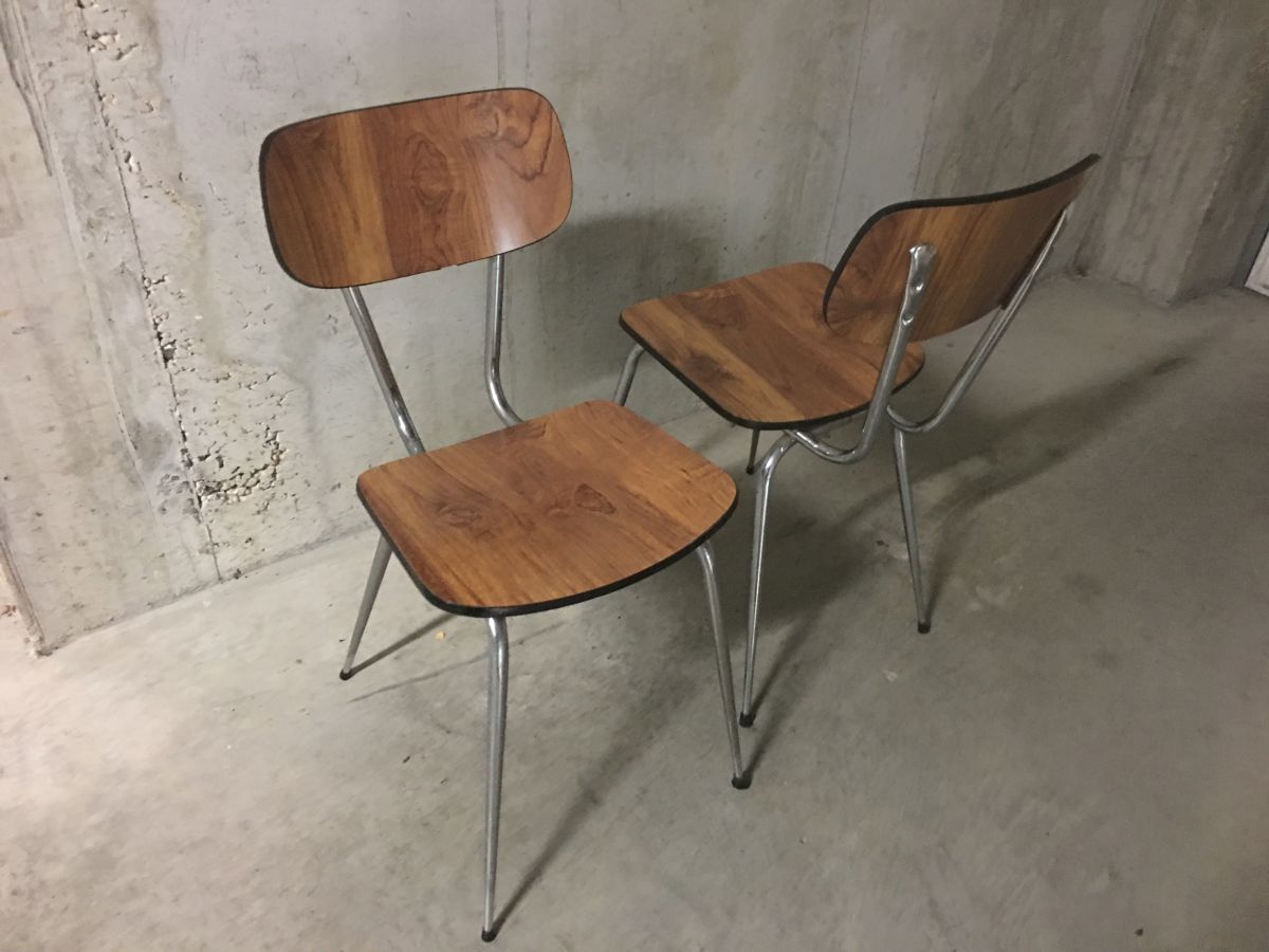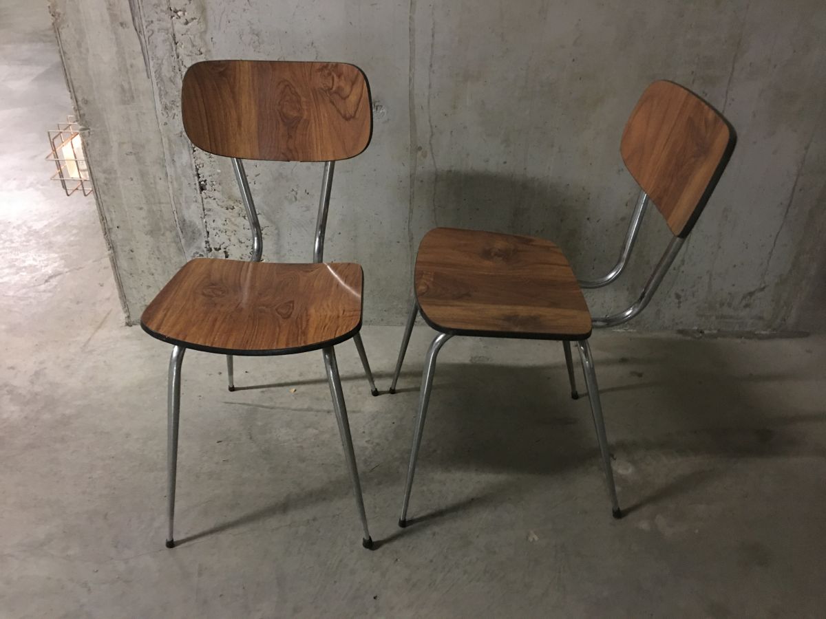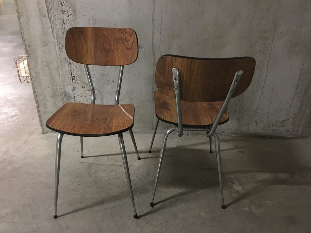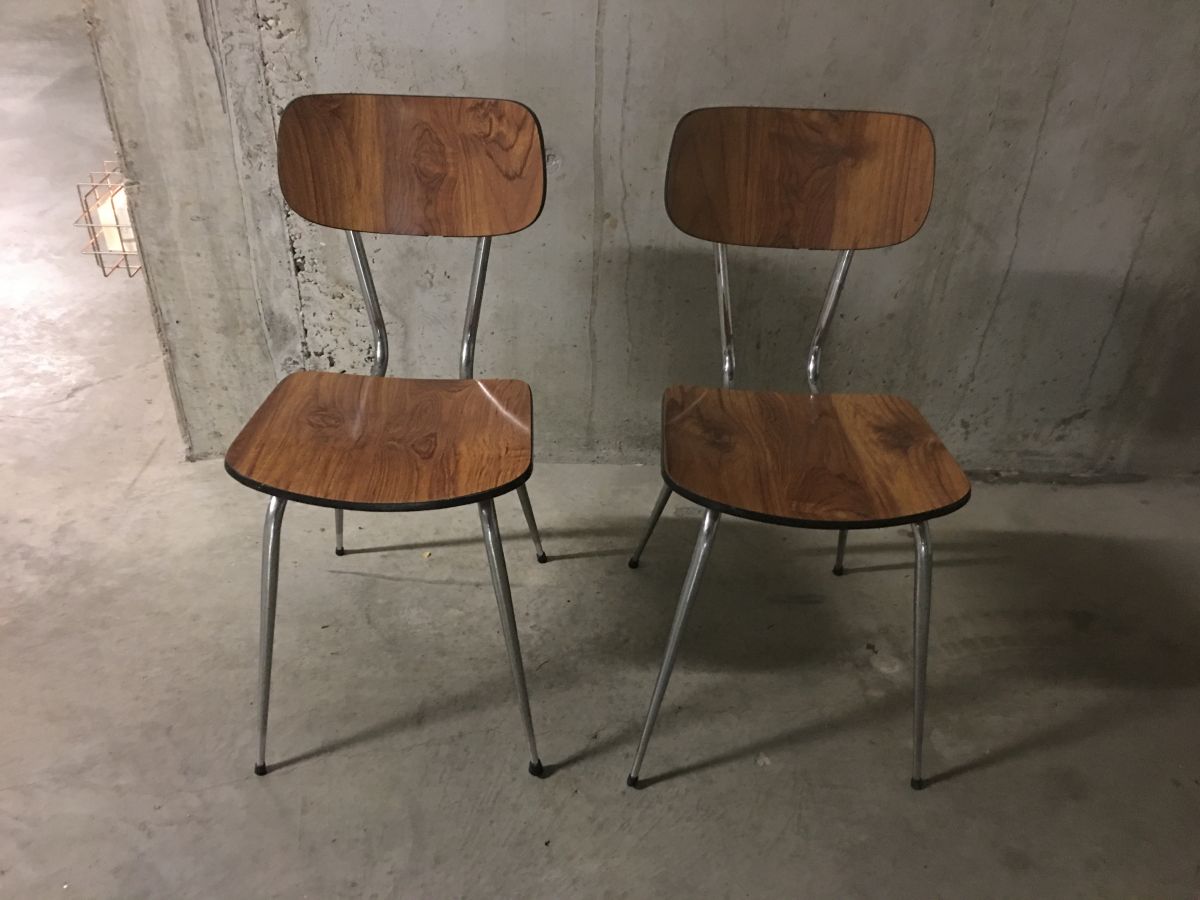 Paire de chaises en formica beige clair imitation bois des années 70, bande de champ noire (un minuscule manque sous l’un des dossiers quasiment invisible – voir photos), quelques piqûres sur le métal tubulaire du piétement dues à un usage normal, hauteur totale 78cm, hauteur assise 45cm, assise 32x36cm, bon état.