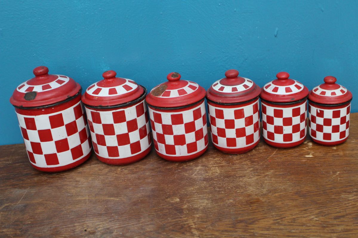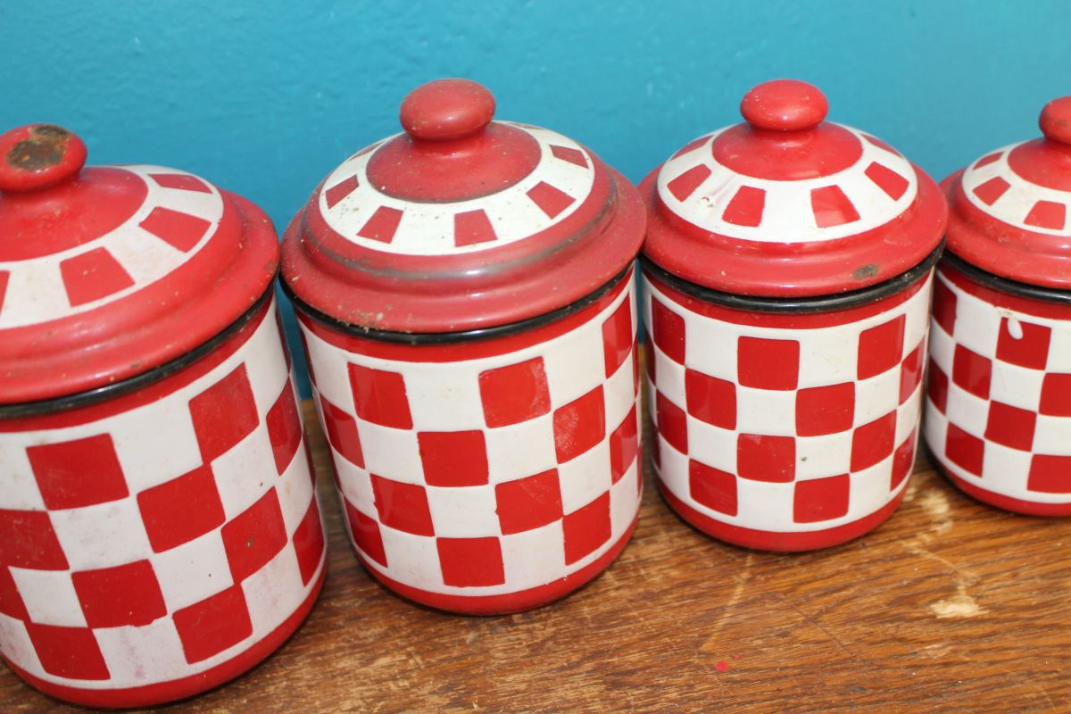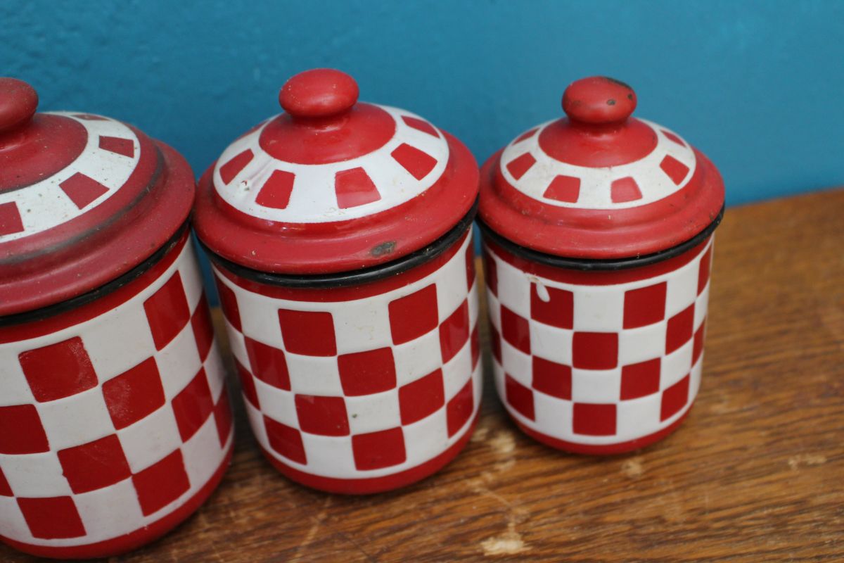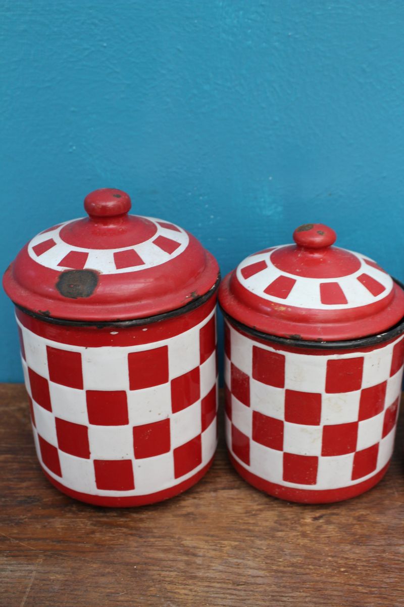 LOT POT ROUGE EN MÉTAL MOTIF CARREAUX ANNÉE 60-70
