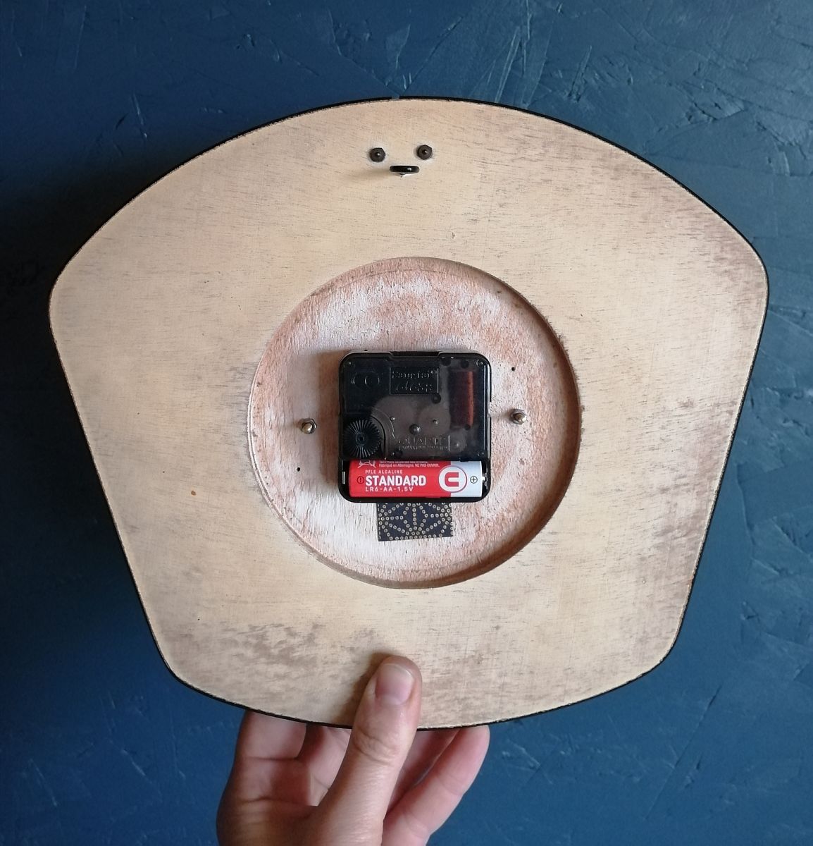Pour préserver votre tranquillité, j'ai choisi un système silencieux qui fonctionne avec une pile alcaline AA et qui vous sera fourni pour l'installer dès sa réception. Le mécanisme (situé à l'arrière de l'horloge) a une petite mollette qui permet de régler l'heure.