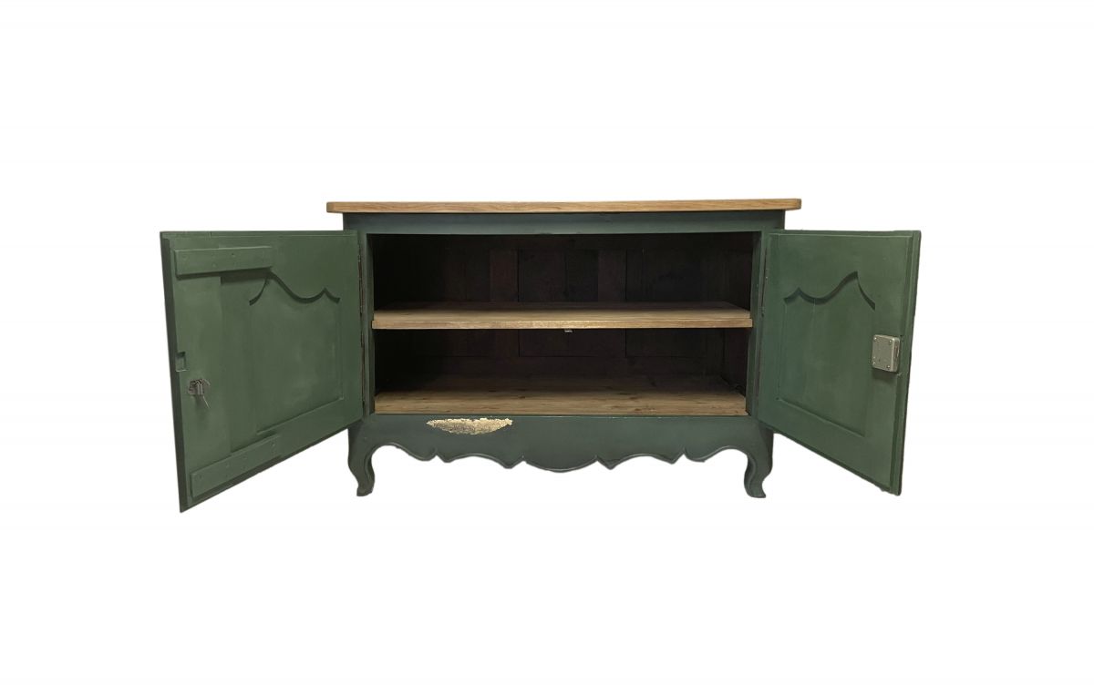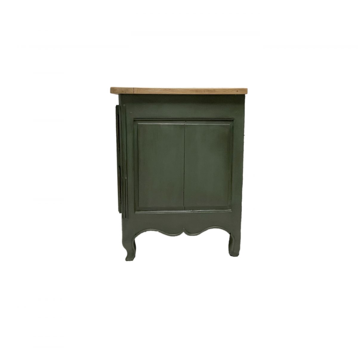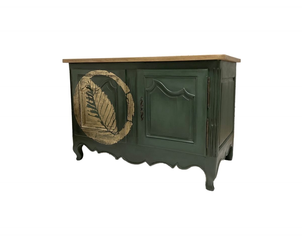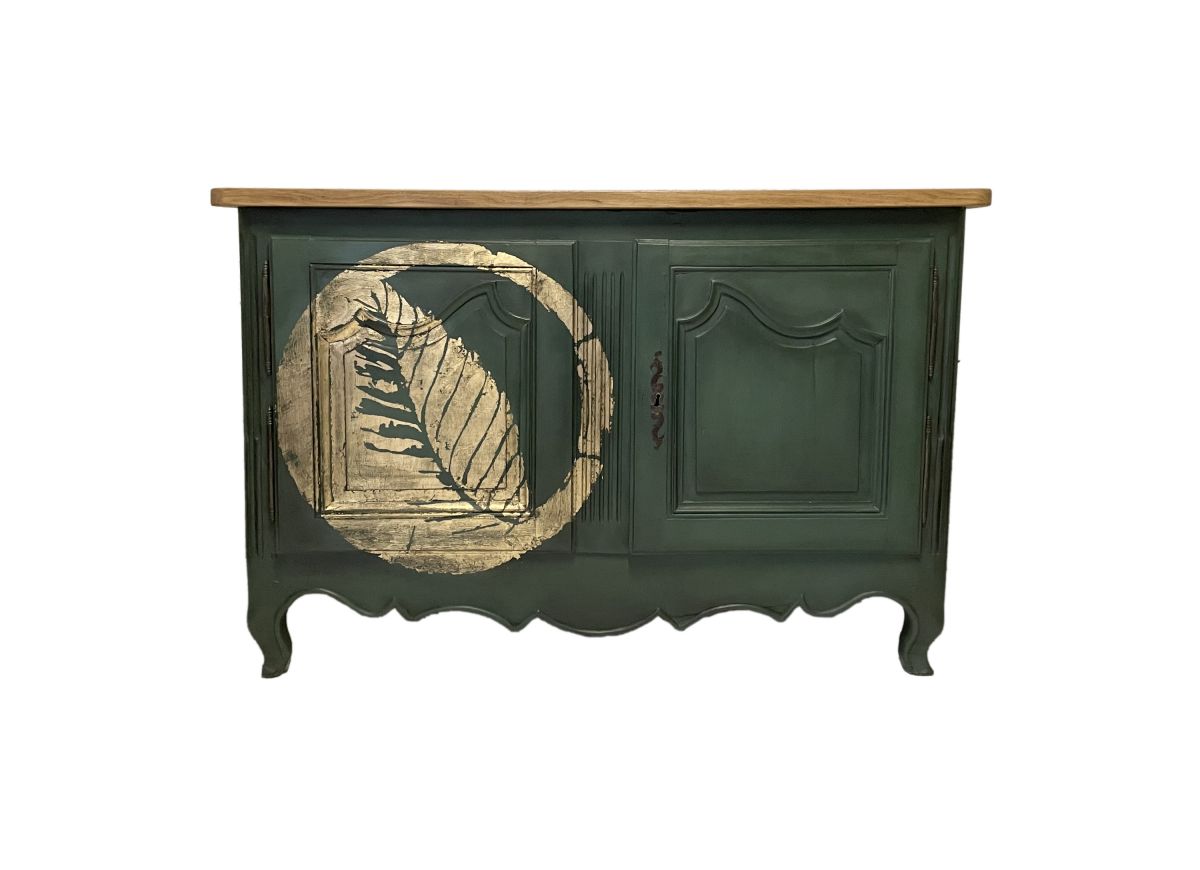Soigneusement nettoyé et traité contre les insectes. Re-stylisé dans une peinture craie vert foncé (Amsterdam Green) et fini avec des cires claires et noires. Le dessus a été poncé, teint et laqué pour révéler le grain du bois. Sur le devant, il y a un motif de feuilles dorées, vieillies pour correspondre au style de l'article. Un article unique impressionnant qui aurait une présence dans un salon ou une cuisine.