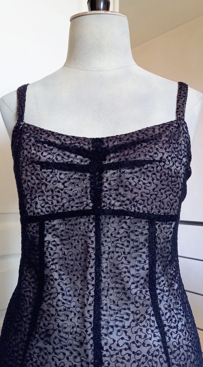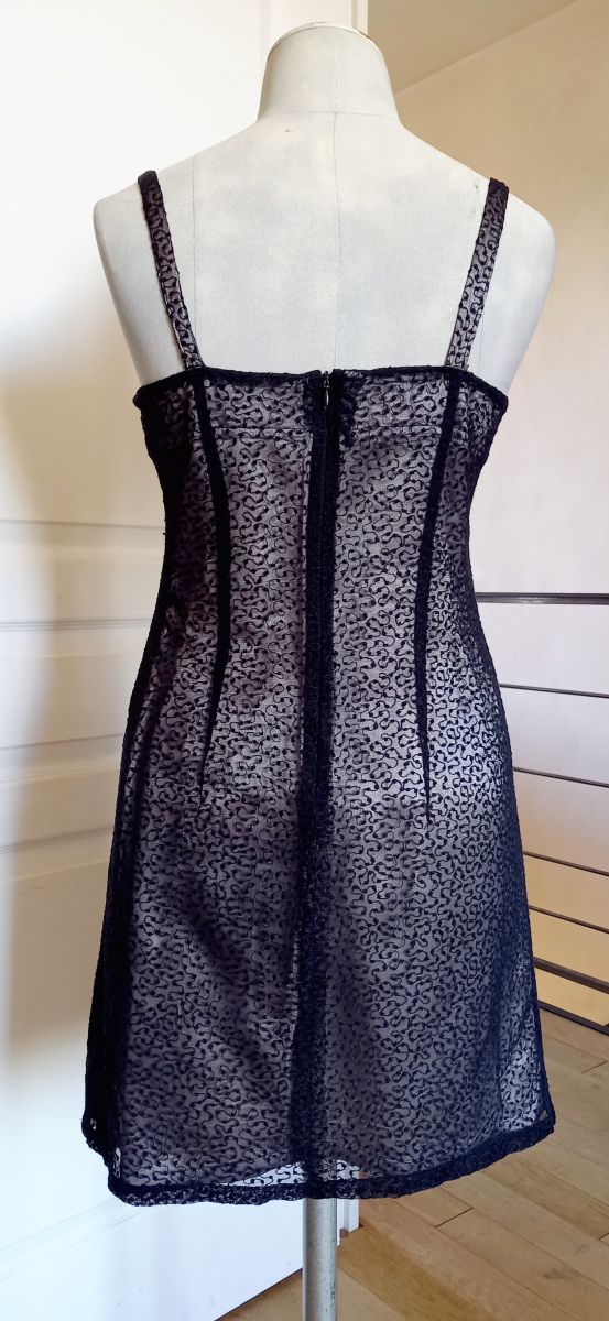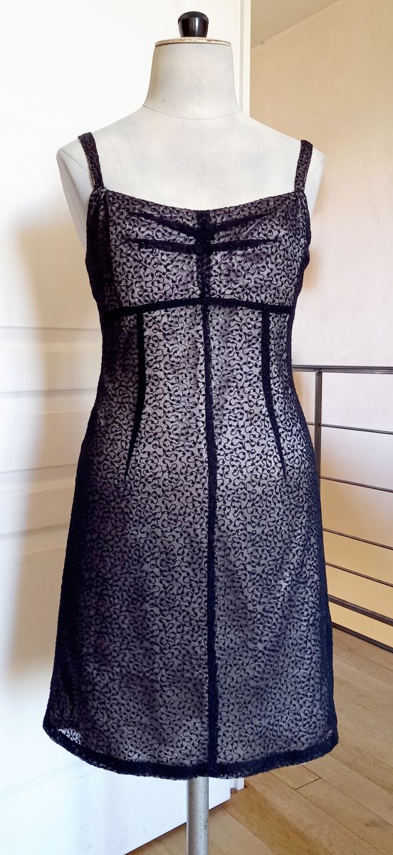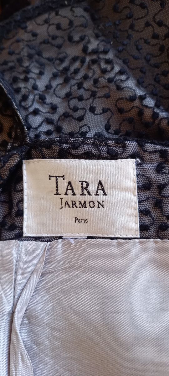 Petite robe élégante et chic en dentelle noire sur une doublure couleur argent. Coupe cintrée, longueur genou. En parfait état. Taille 38. Marque Tara Jarmon.