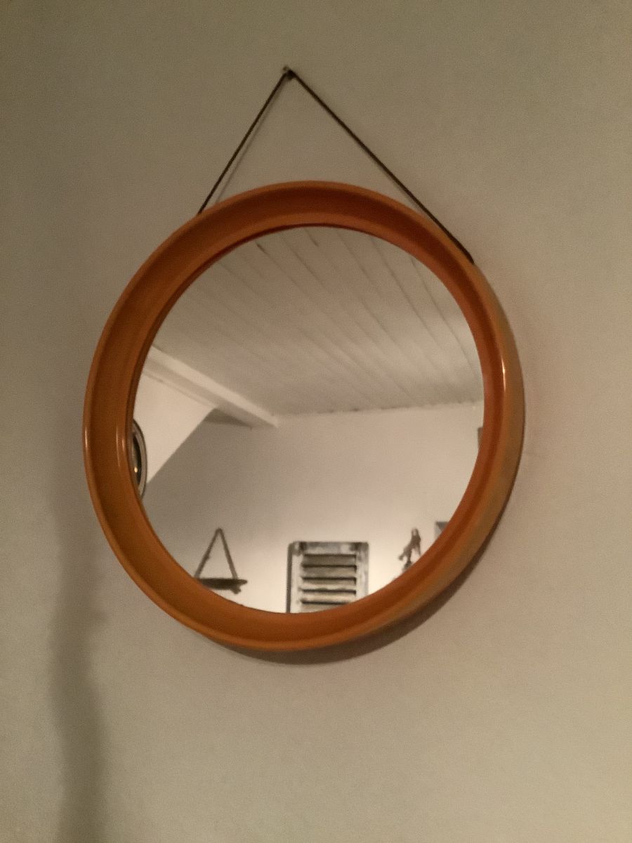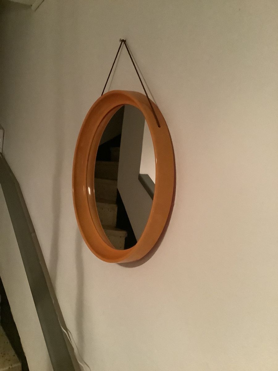 Miroir rond en plastique orange.