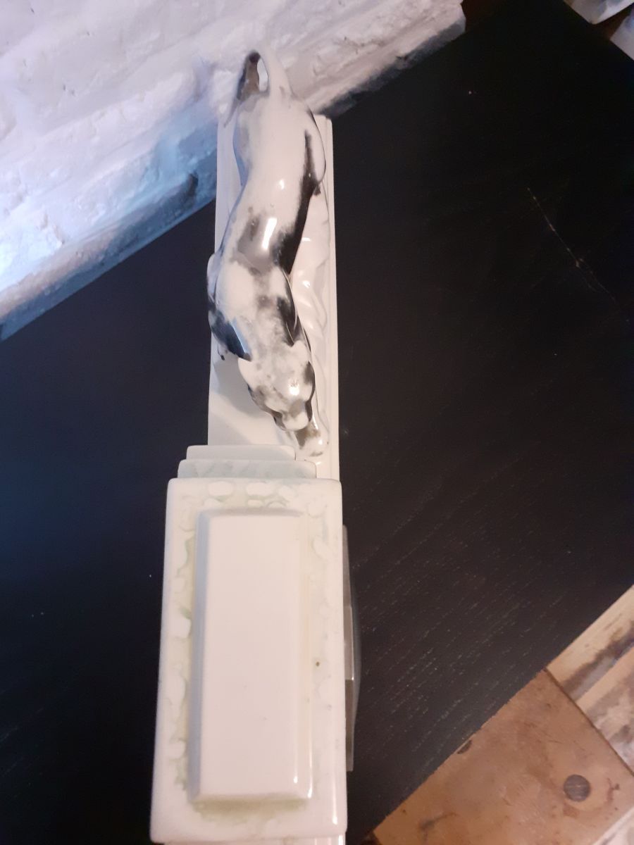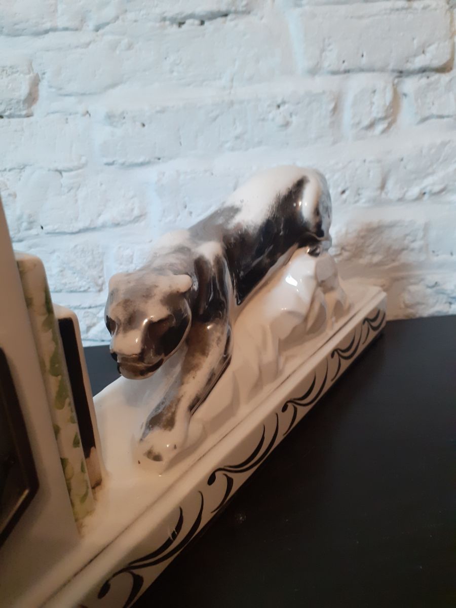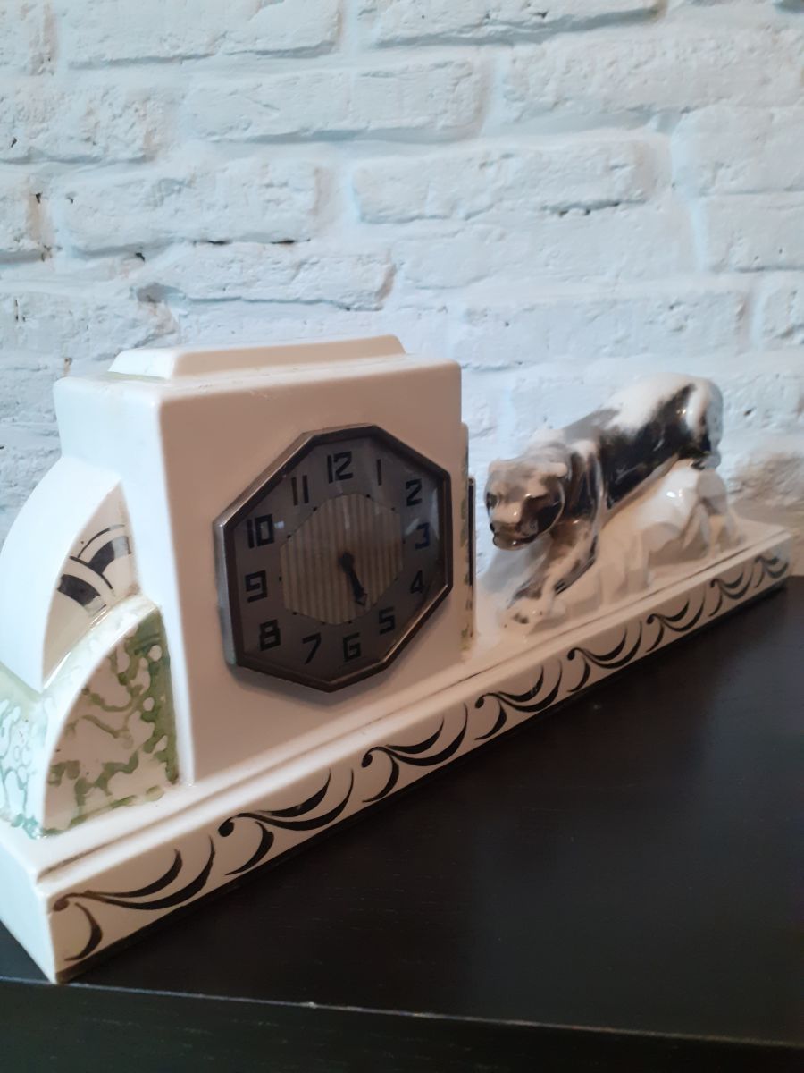 Horloge Art deco signee en ceramique trace d usage ,pas d eclat voir photo mecanisme a revoir ne fontionne pas.