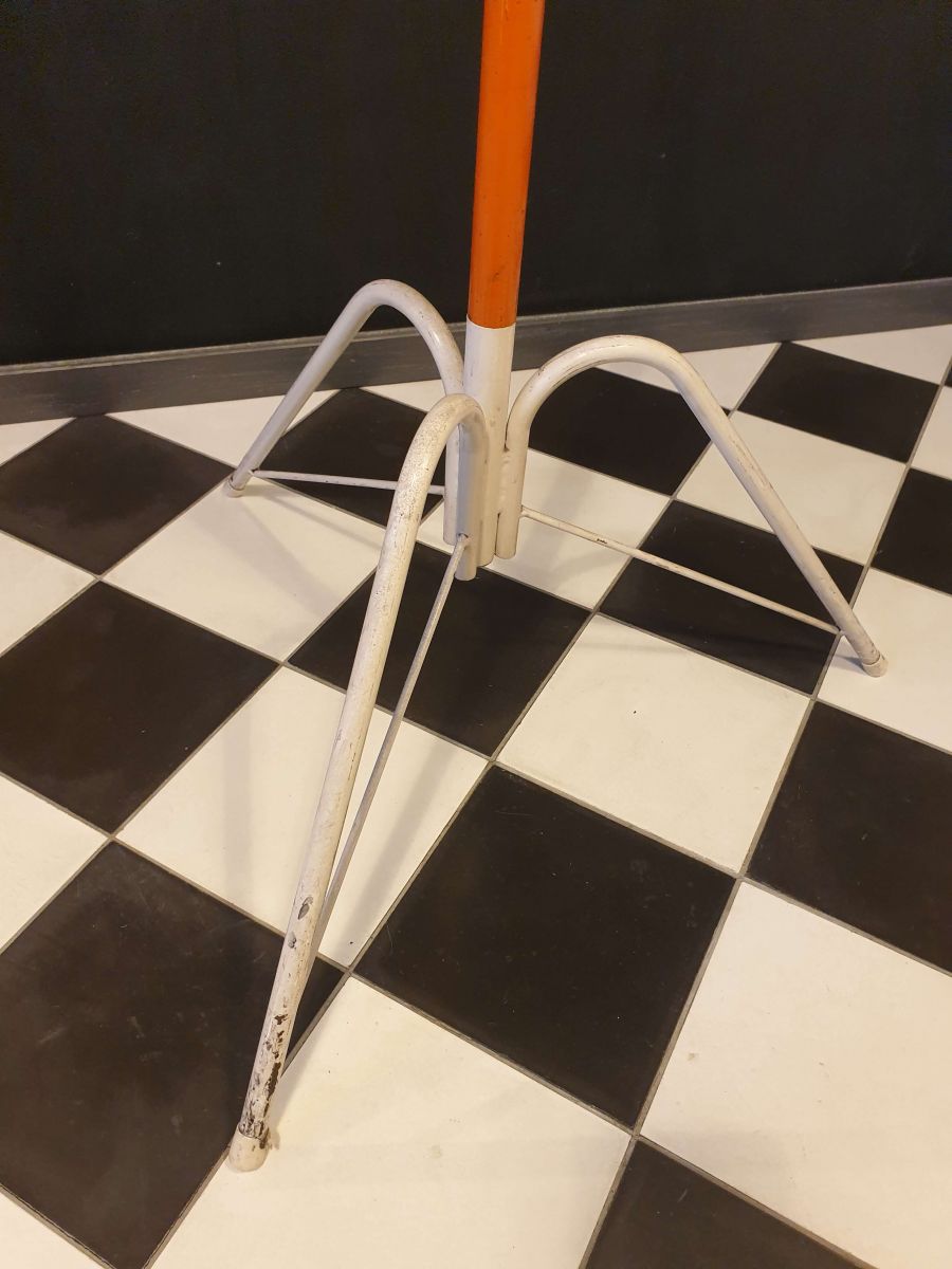 Ce porte manteaux est en métal pour l'armature avec 8 boules en bois orange, le tout sur un piétement tripode en métal.