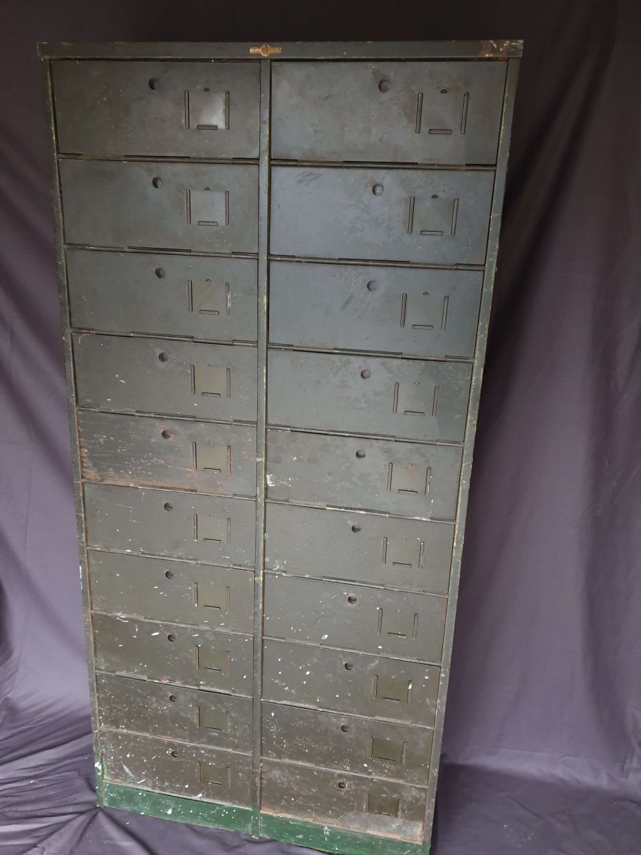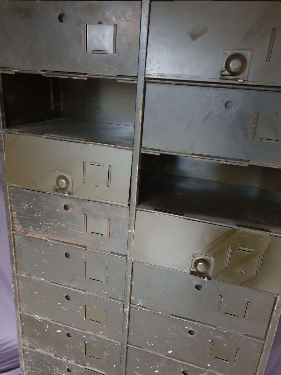 Marque phare dans le mobilier industriel Ronéo est devenue une référence pour la qualité de ses produits. Ici, un meuble à 20 clapets, laissé dans son jus tellement son authenticité lui donne du cachet.Chaque avant de tiroir peu accueillir une étiquette dans l'espace prévu à cet effet. La marque de l'entreprise est encore visible en haut du meuble. Pour une décoration industrielle, loft, restaurant, bureau, salon, etc.