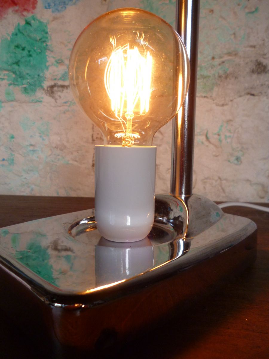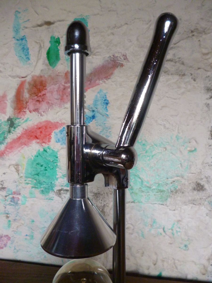 Lampe realisee a partir d'un presse agrumes manuel en metal chrome .