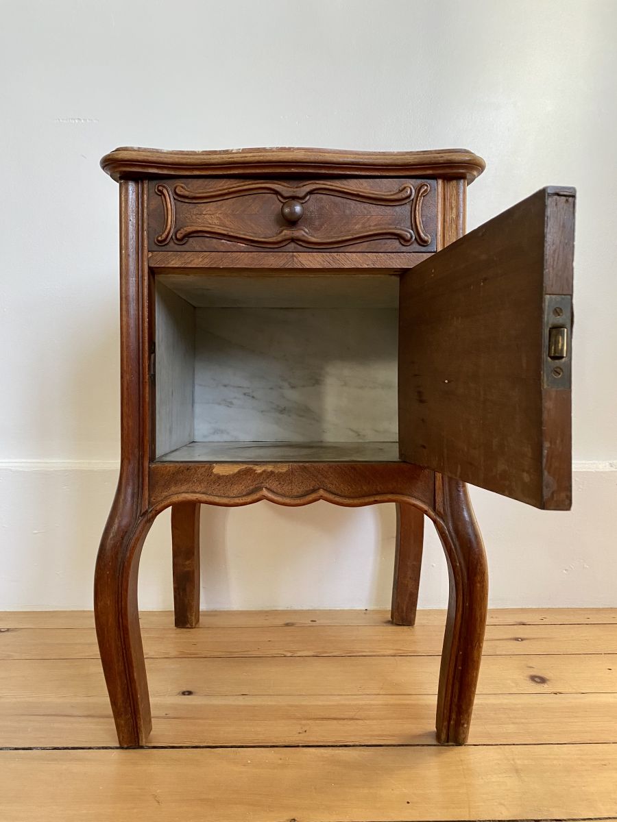 Table de chevet Louis XV restauré. Tout le plateau est en véritable marbre Suprême Salomé rose, sublime. Le petit tiroir est tout en bois et le placaret (petit placard?) est entièrement fait de marbre blanc ce qui lui confère des allures de coffre fort... vous y mettrez bien ce que vous voulez.