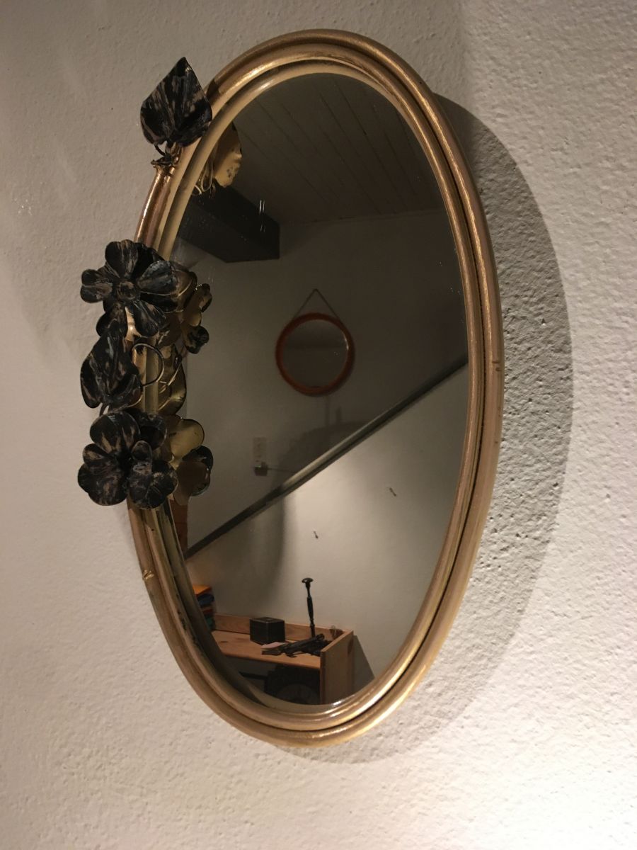 Miroir de style art déco en métal, ornait de petites fleurs.