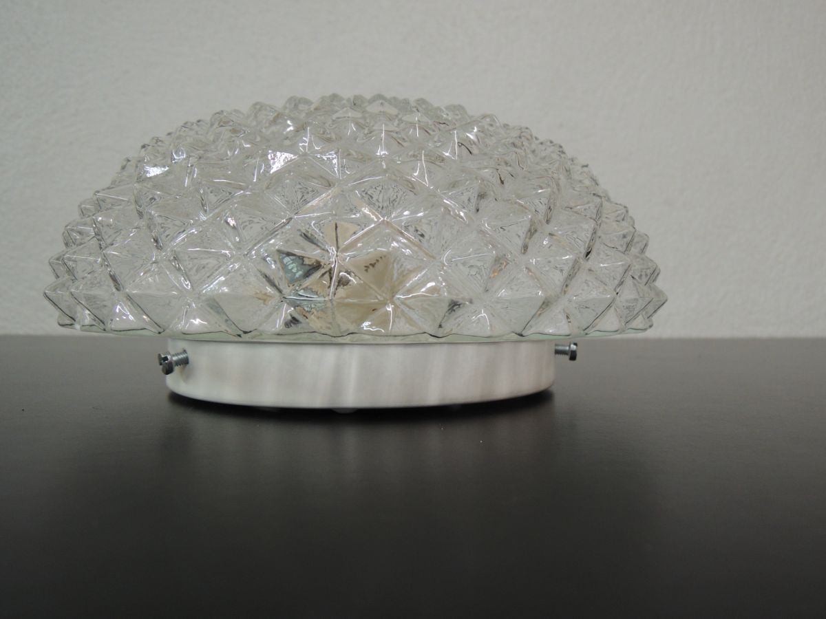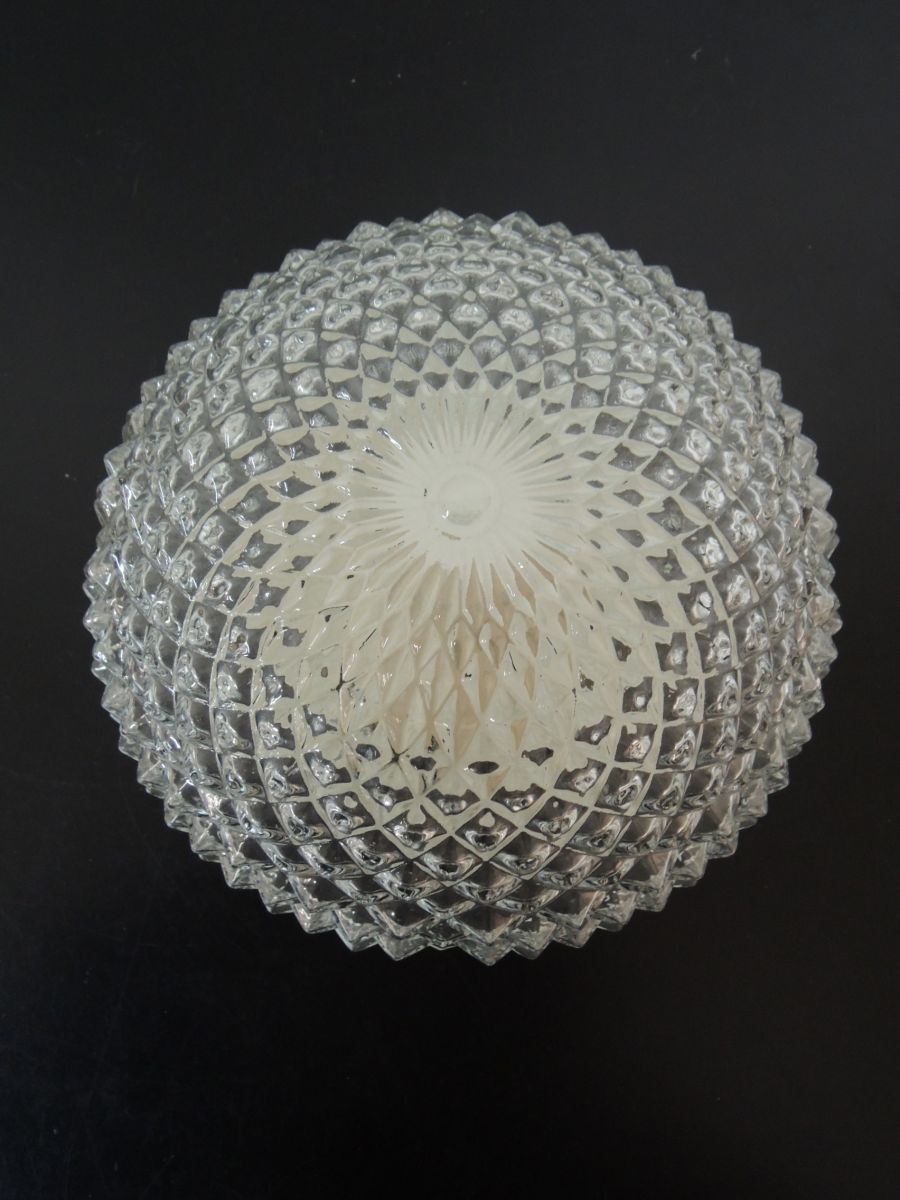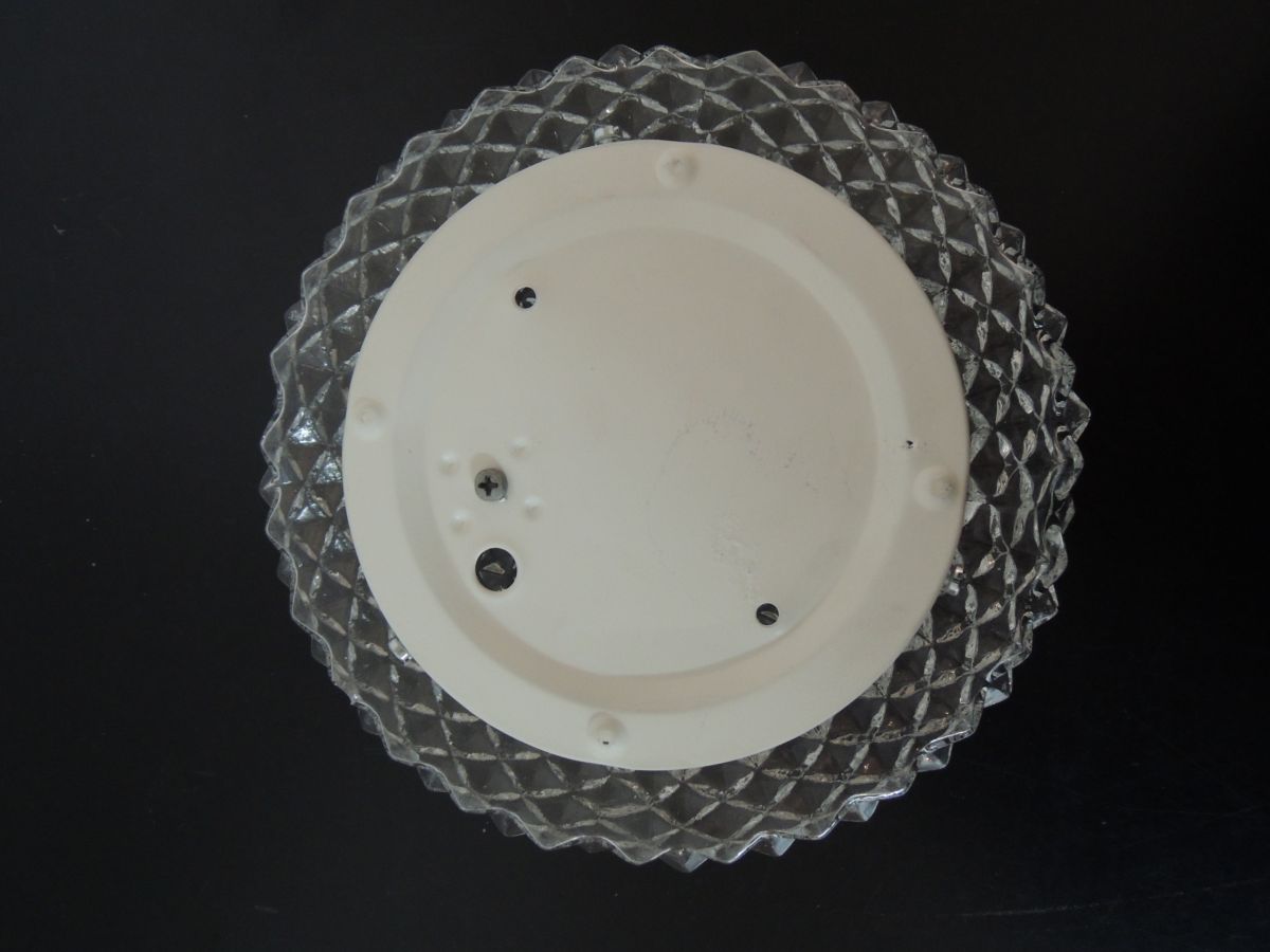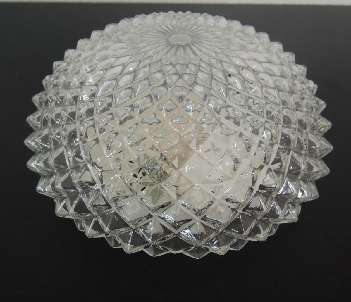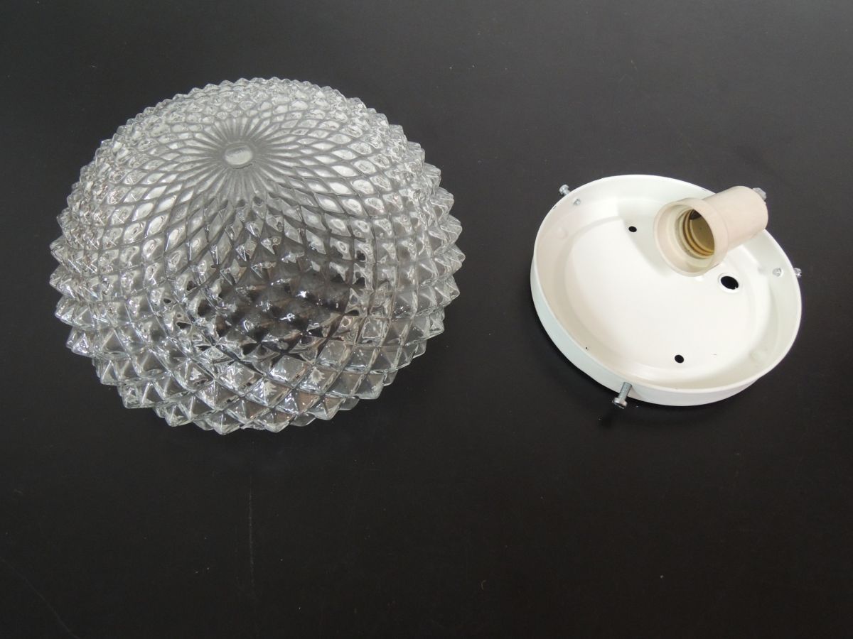 Plafonnier, pouvant s'utiliser en applique, avec globe demi-lune en verre moulé avec motif en "pointes". Globe maintenu sur socle métallique (diamètre 13.5 cm) par 3 vis (neuves). Équipé d'une douille céramique à vis type E27. Vendu non câblé