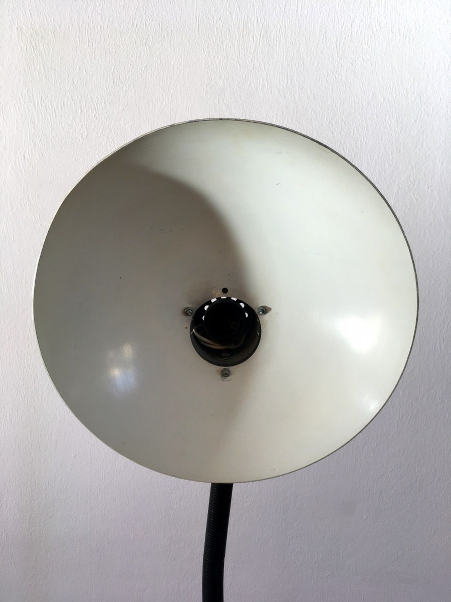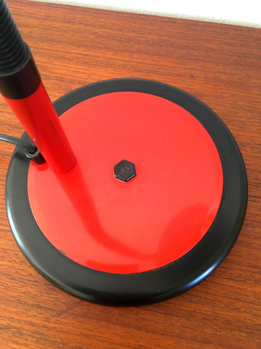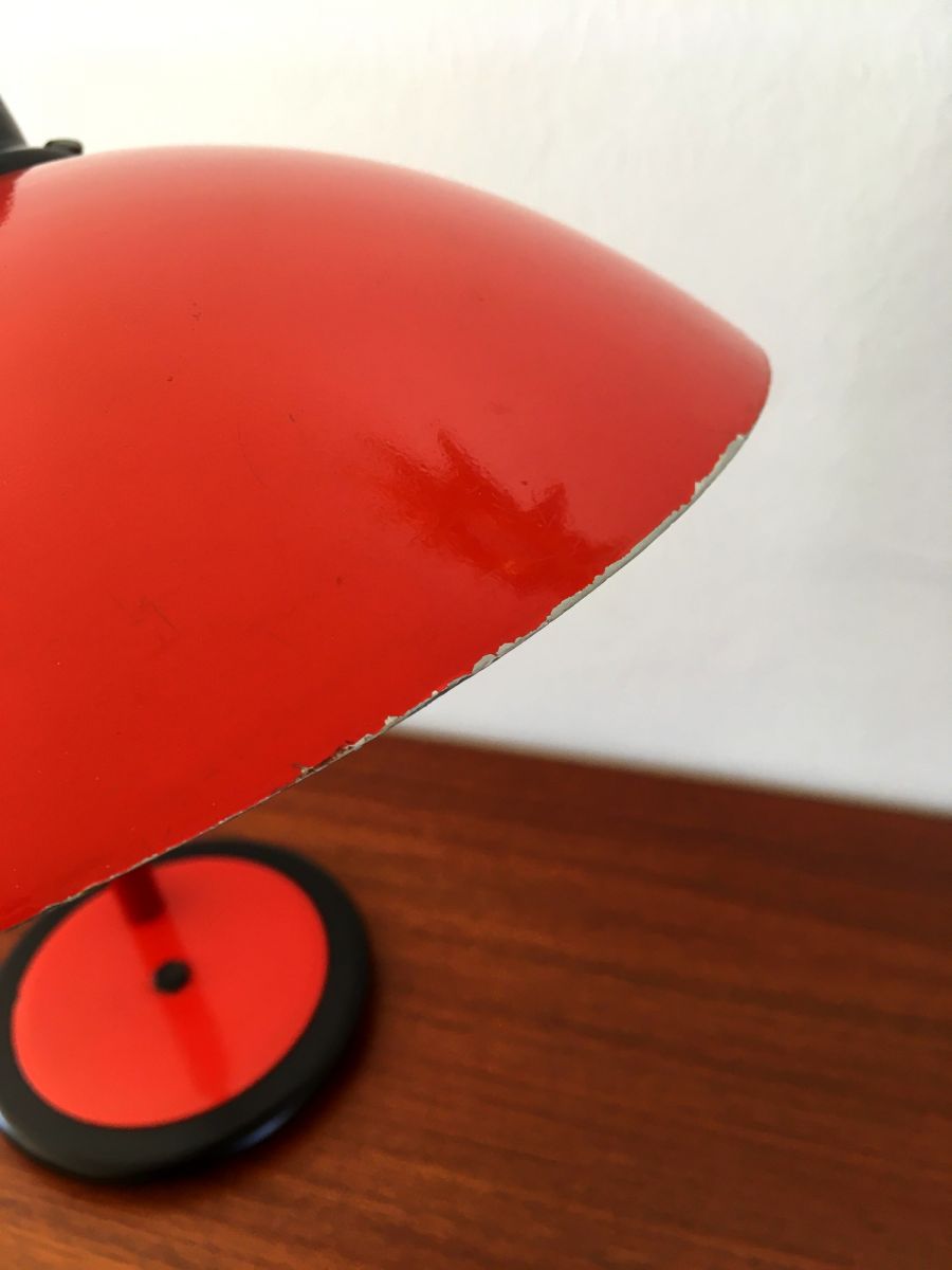 Diffuseur et socle en acier laqué rouge, flexible gainé de plastique noir, estampillée. Douille à vis e27 standard, électrification testée. Traces d'usage visibles sur les photos.