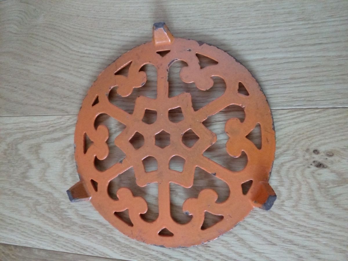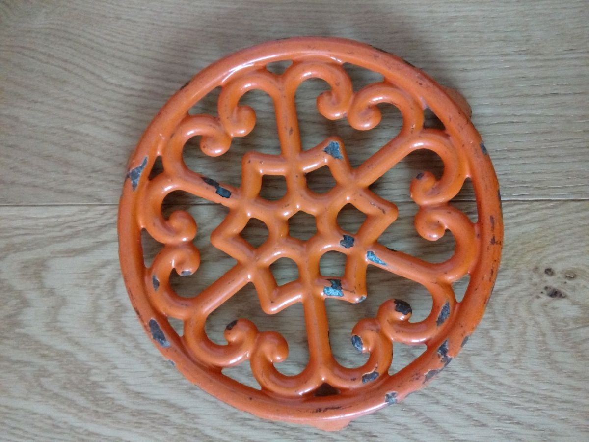 Avec ce dessous de plat, charmant et utile, on mélange deux époques ! Les motifs stylisés, géométrisés rappellent le style art déco et la couleur orange flashy de la fonte émaillée fait très « années 70 ». La couleur orange est plus flashy, lumineuse, brillante en réalité que sur les photos. Il ne comporte ni cassure, ni fêlure, mais de nombreux éclats sur l'émaillage : la patine du temps et surtout de l'usage; ) il mesure 19, 5 cm de diamètre et 2 cm de hauteur. Il pèse 0, 6 kg.