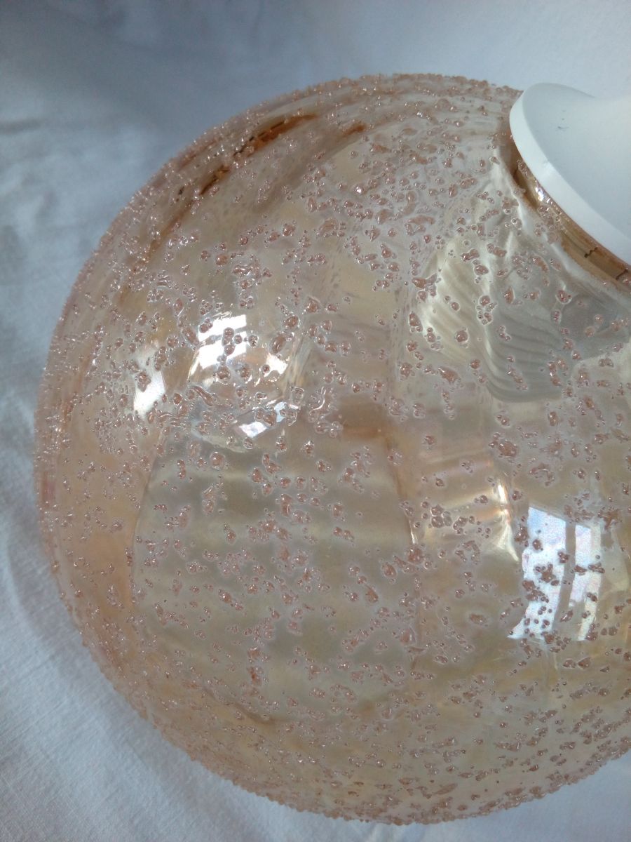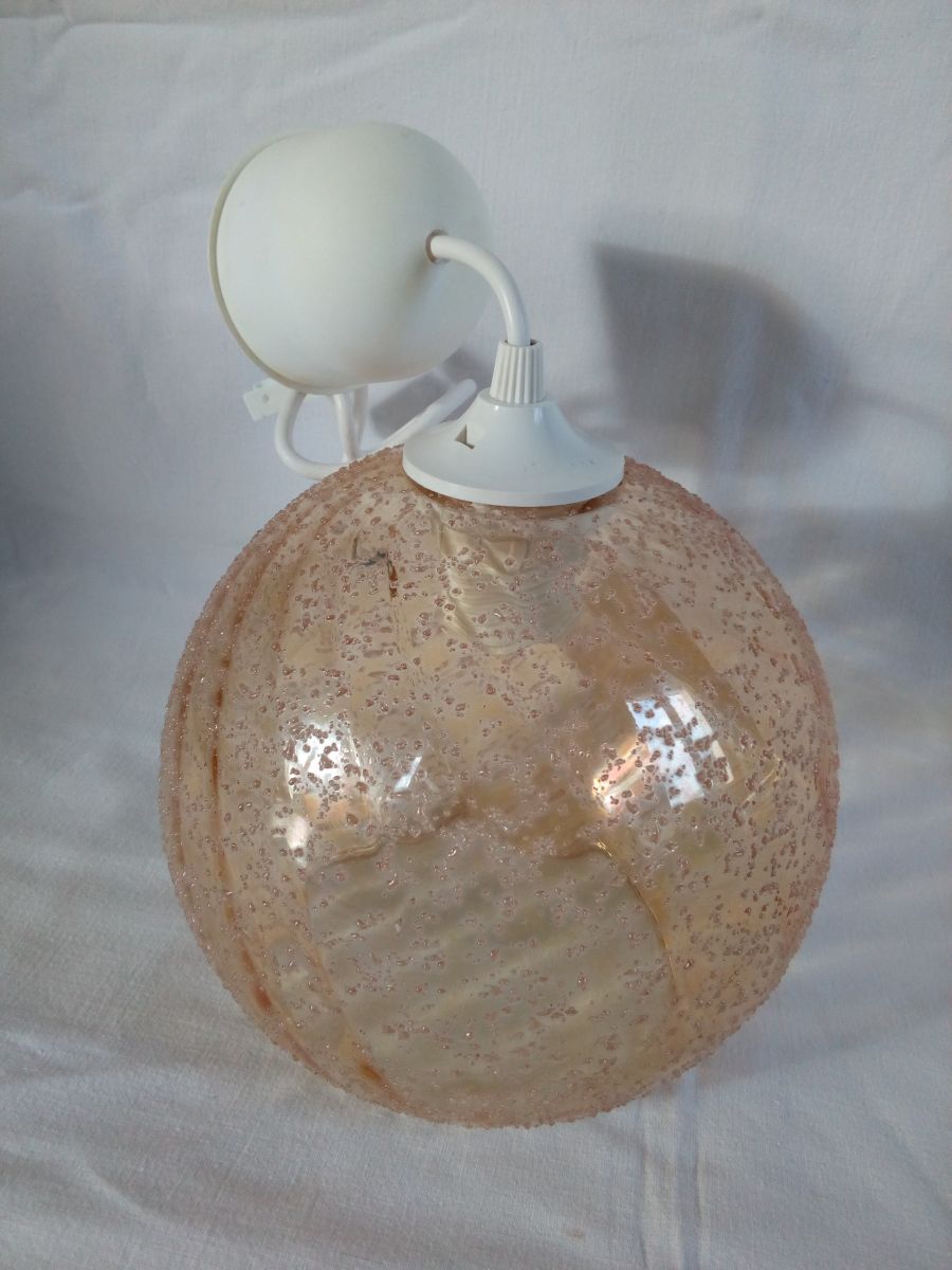 Suspension avec son charmant globe en forme de boule, en verre de couleur ambre avec un aspect granuleux sur l'extérieur, et un effet « vague ». Le globe est en bon état, aucune fêlure, aucun manque. Je ne sais pas de quand il date. La partie « électrique et fixation » est complète ( douille, câble, anneau d'accroche, dominos de raccordement électrique) et semble relativement récente, peut-être a t-elle été remplacée Seul le plastique du « cache piton » (le cache au niveau de la fixation au plafond) est un peu taché et jauni. Le globe mesure environ 20 cm de diamètre, le câble fait une quarantaine de centimètres de longueur. Le tout pèse 515 g.