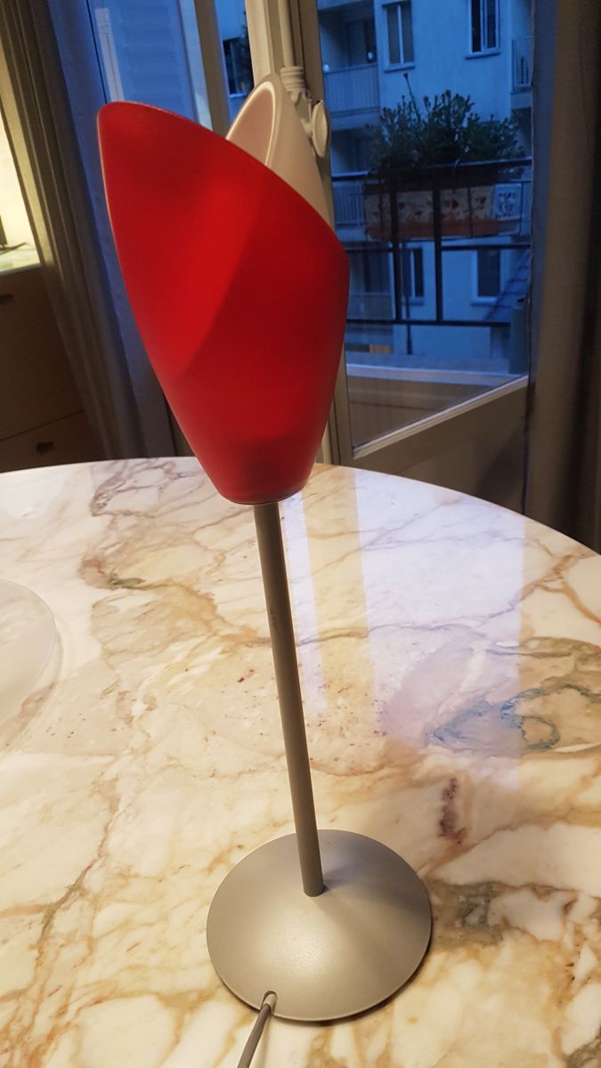Lampe à poser en métal argenté et verre dépoli blanc et roug