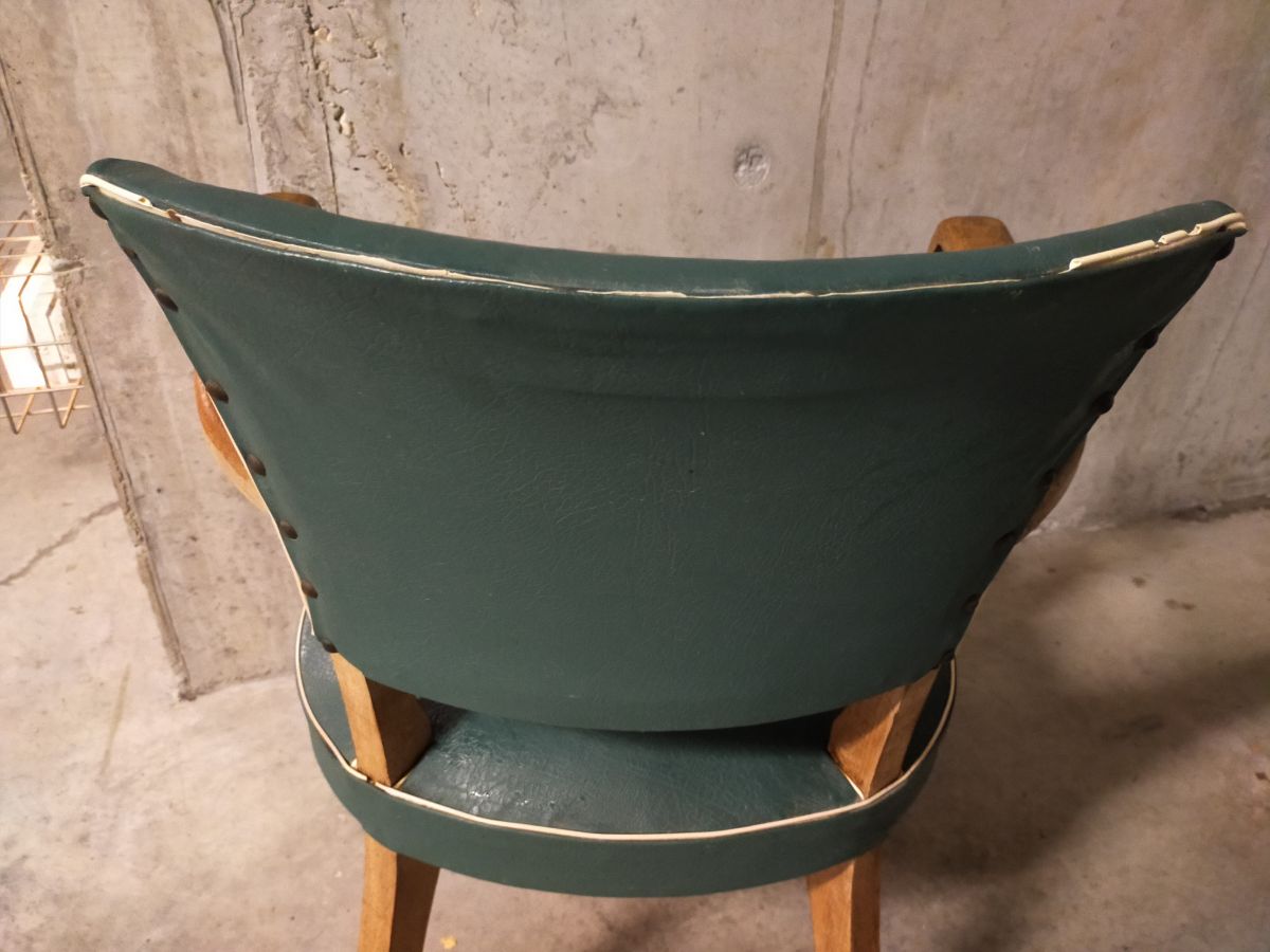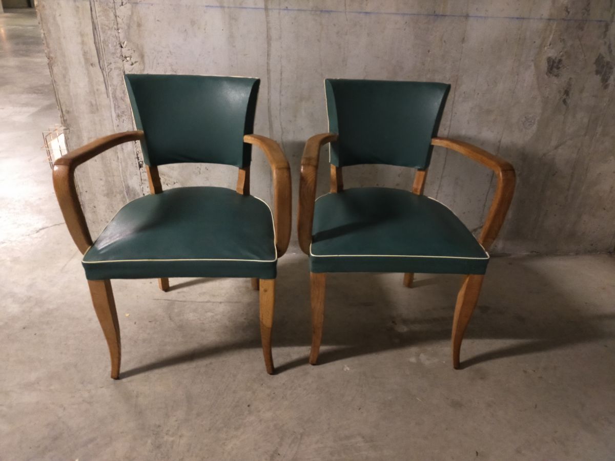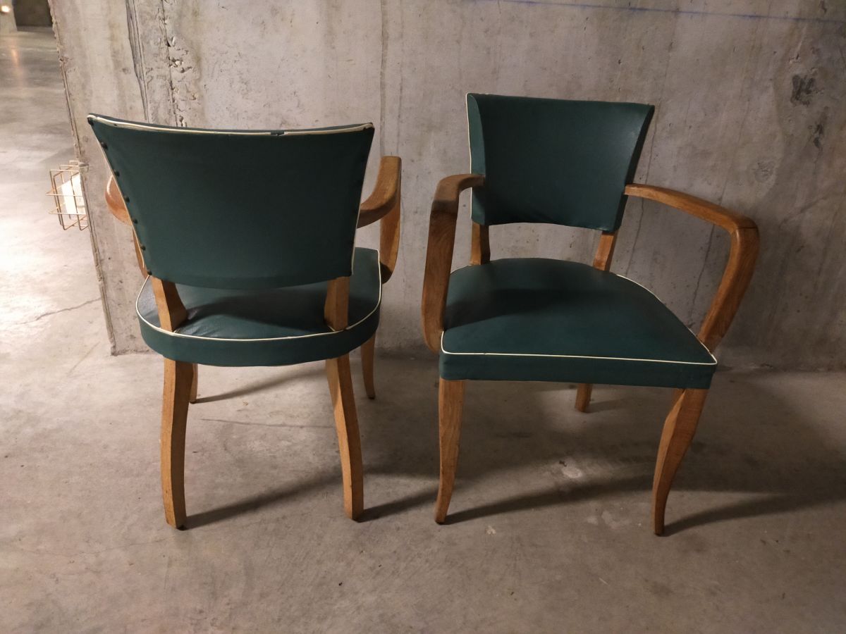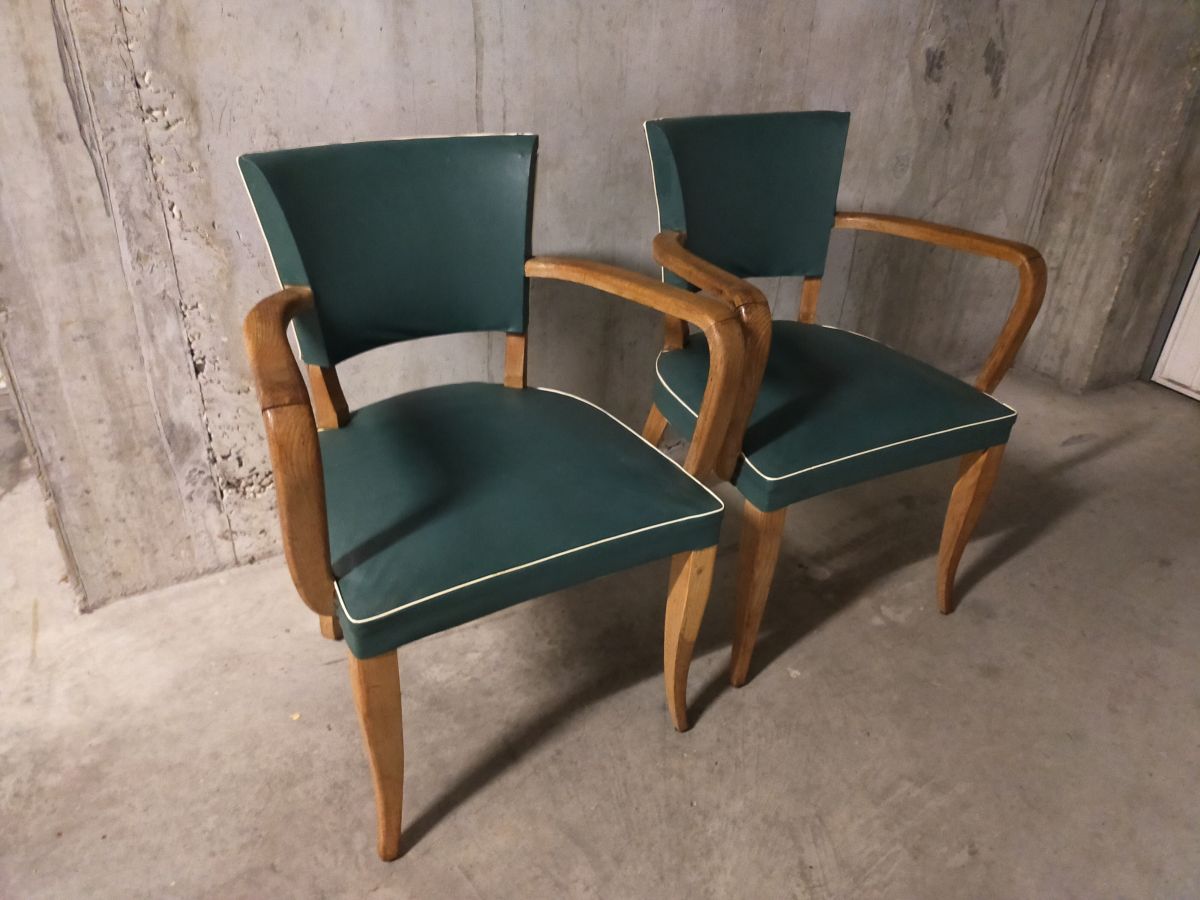 Paire de fauteuils bridge années 50 en vinyle vert, montants en bois massif, quelques traces d'usage et des manques sur le liseré du dossier (voir photos), un peu de jeu au niveau des accoudoirs, assise en bon état, hauteur totale 80cm, assise 50X45cm, hauteur assise 44cm, largeur totale 60cm, profondeur totale 60cm, très stables et sains, vendus en l’état.