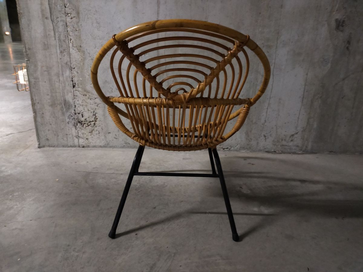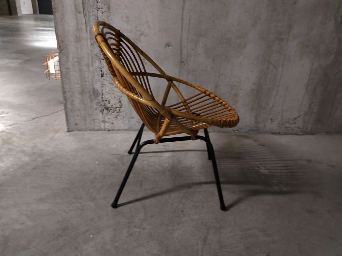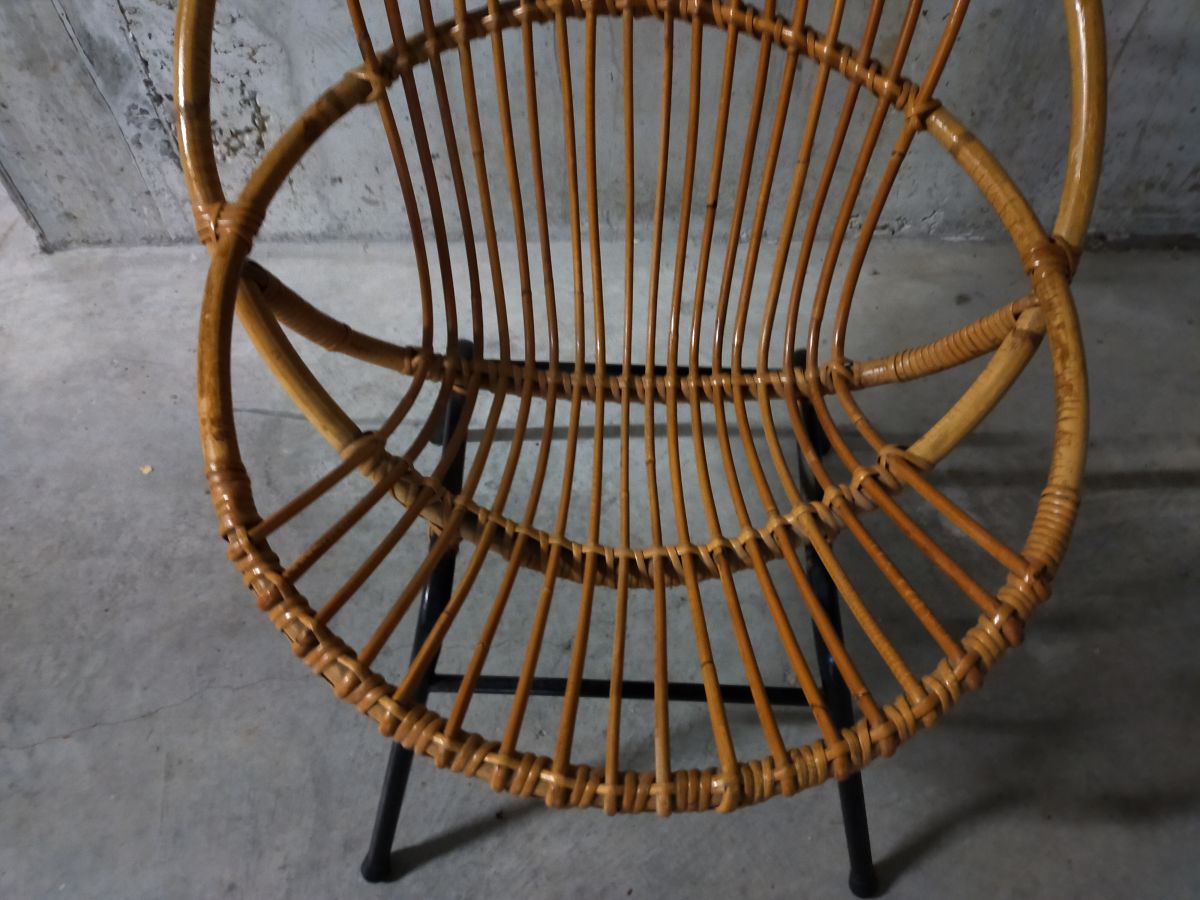 Fauteuil corbeille en rotin des années 60, superbe patine du temps, aucun manque, très stable et solide, piétement en métal tubulaire noir, hauteur 78cm, hauteur assise 41cm, assise 45x40cm, dimensions hors tout (cm) : L.62xH.78xP.62, bon état.