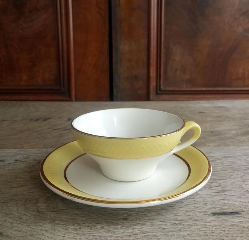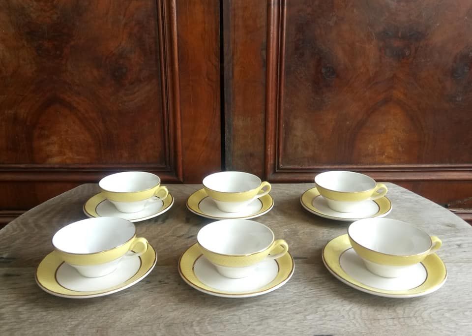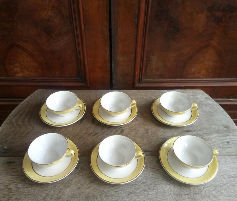 Ensemble 6 tasses à café et leurs soucoupes en faïence blanche et jaune ( liserés dorés)