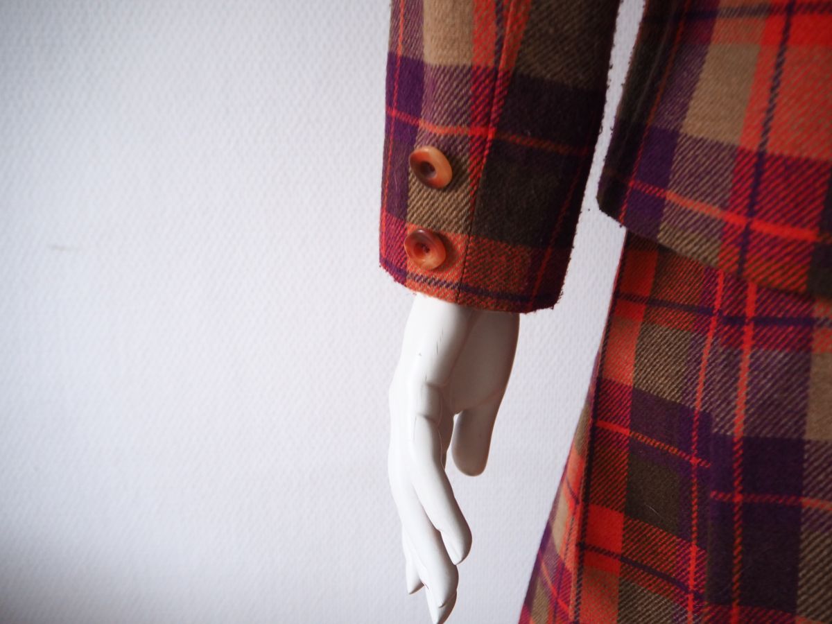 Cet adorable ensemble est composé d'une veste cintrée et à épaulettes et d'une jupe plissée. Les carreaux sont dans les tons orangés/prunes/ocres, très jolis !