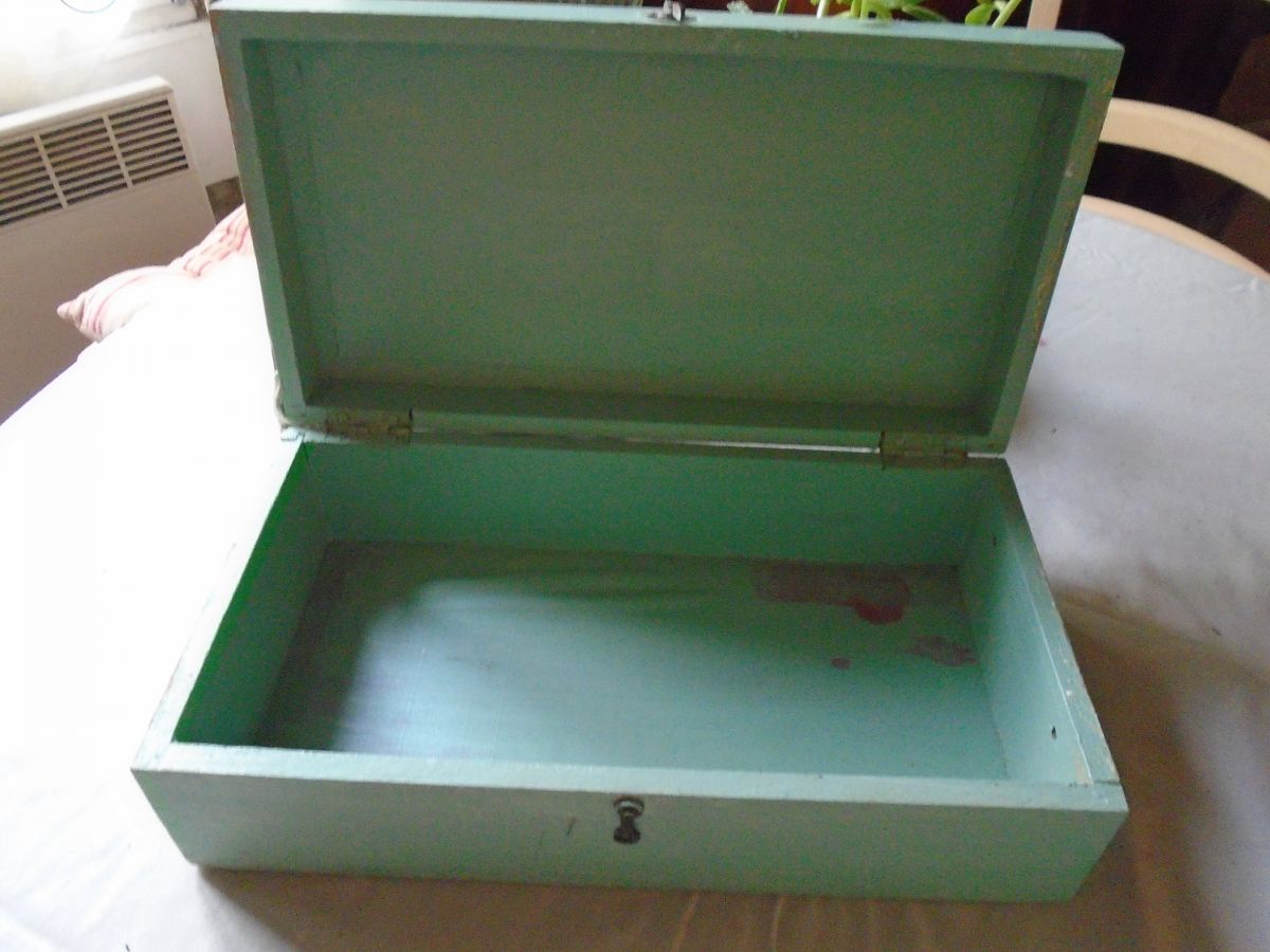 Boite en bois peint vert, une face non repeinte, bois et charnières en très bon état,